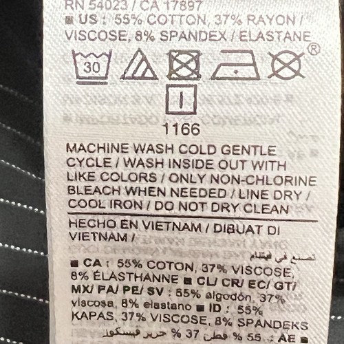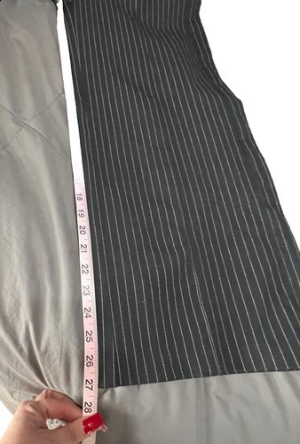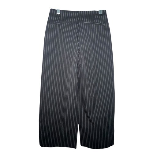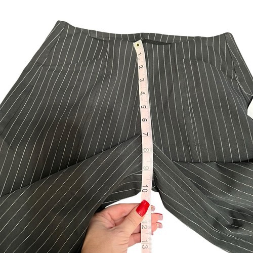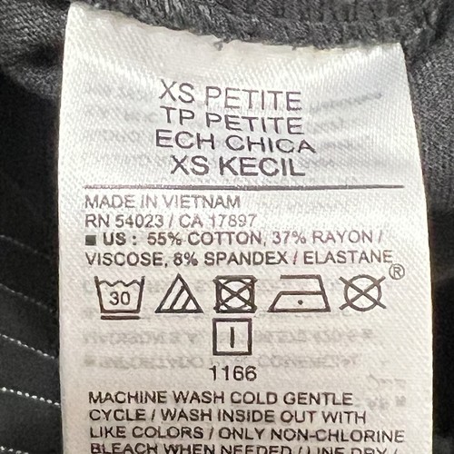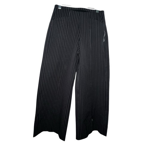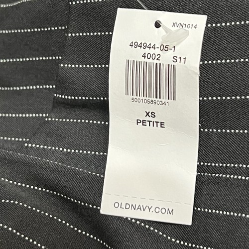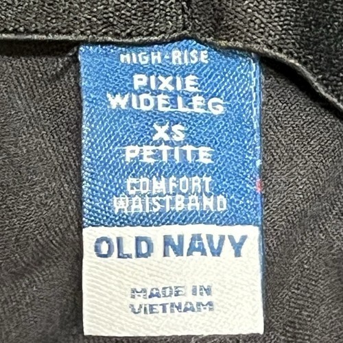 These are Old Navy high rise pull-on Pixie wide leg pants in XS Petite size. They are black with white pinstripes, made of a Rayon, Cotton, Cotton Blend fabric. The pants have a striped pattern, flat front, and elastic waist for easy wear. Suitable for various occasions like travel, parties, work, or casual wear. The style is reminiscent of the 90s and preppy fashion with a city-inspired theme.