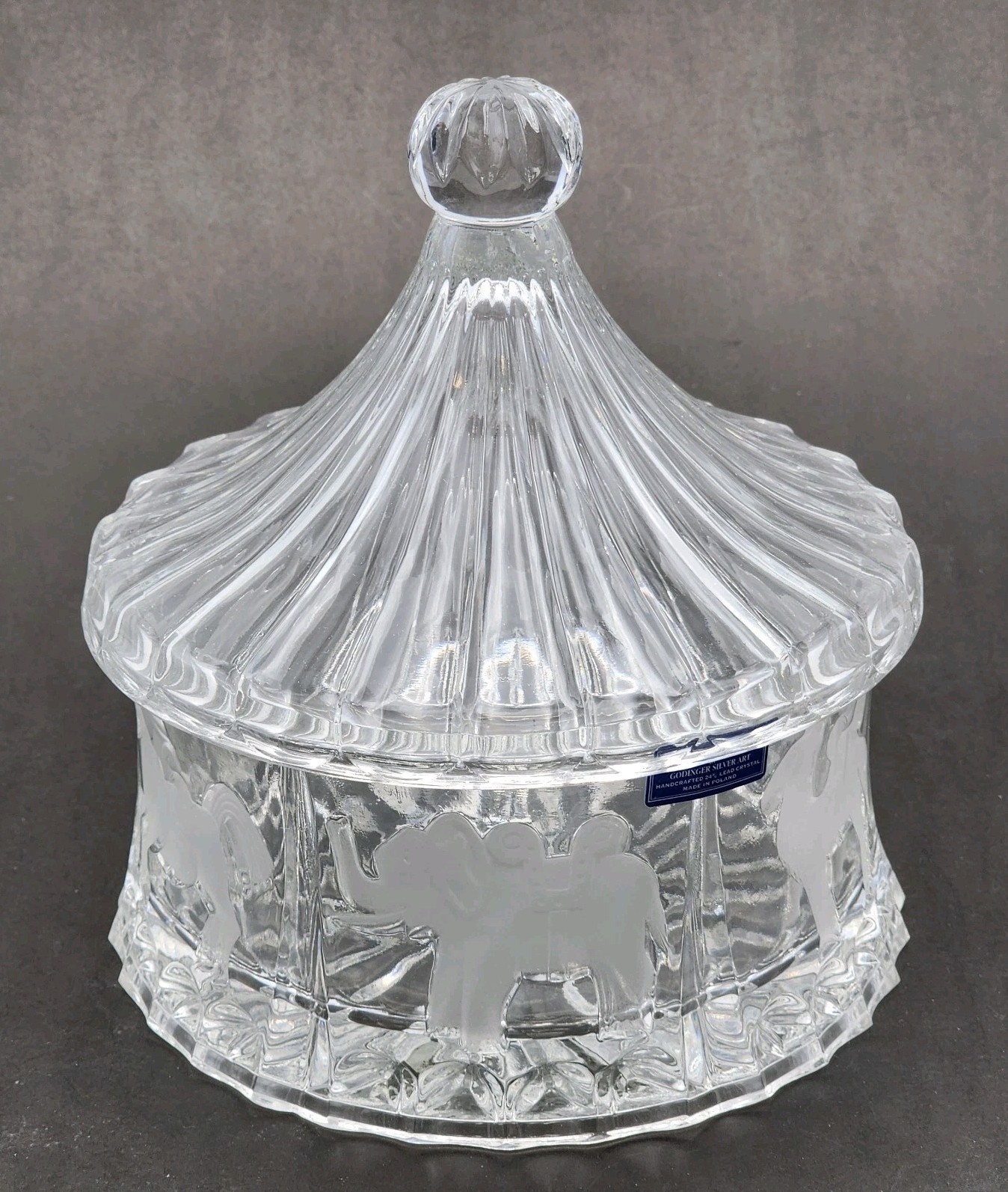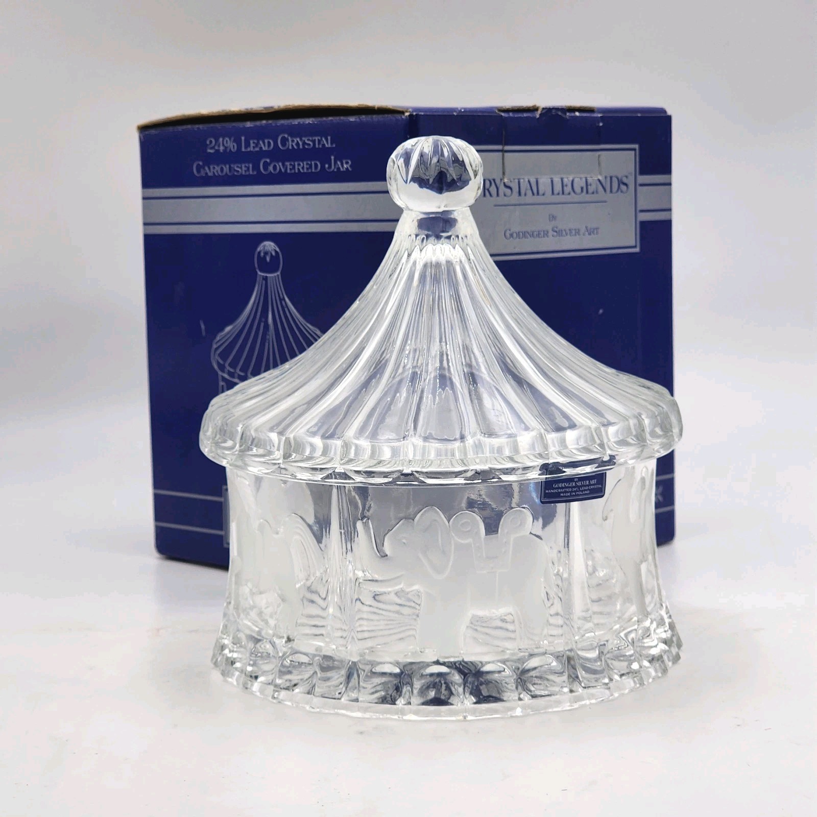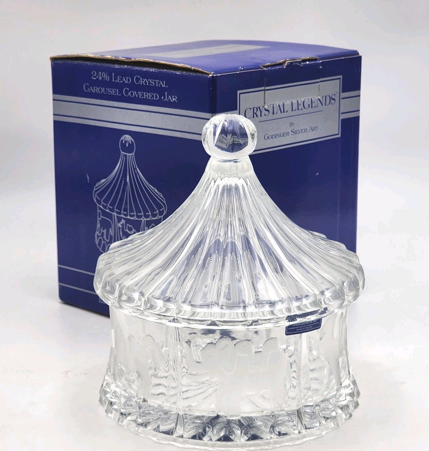 Godinger Crystal Legends Carousel Candy Dish 24% Lead Crystal Jar w/ Lid Boxed