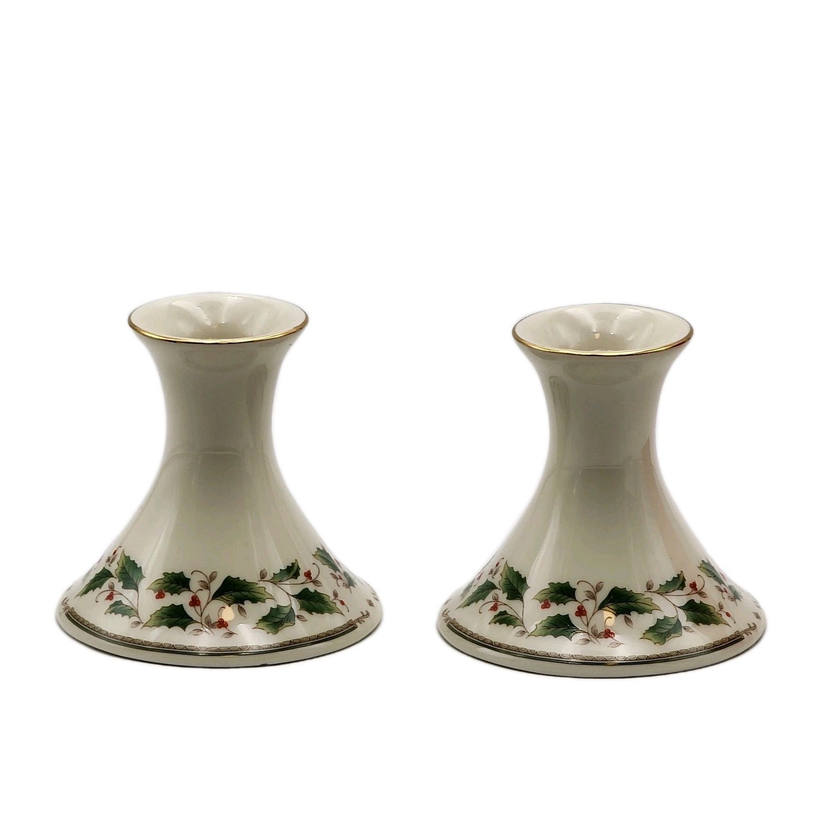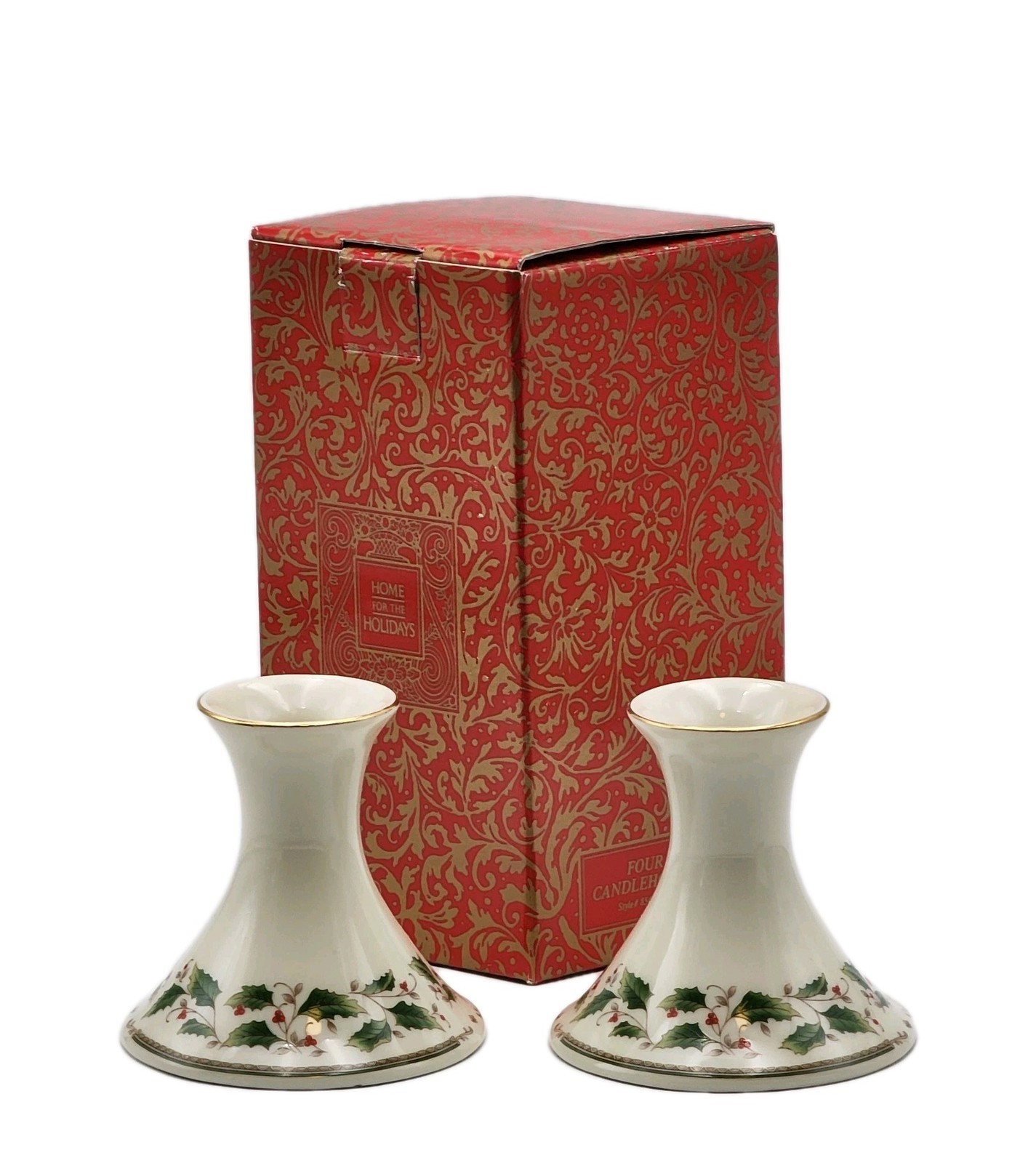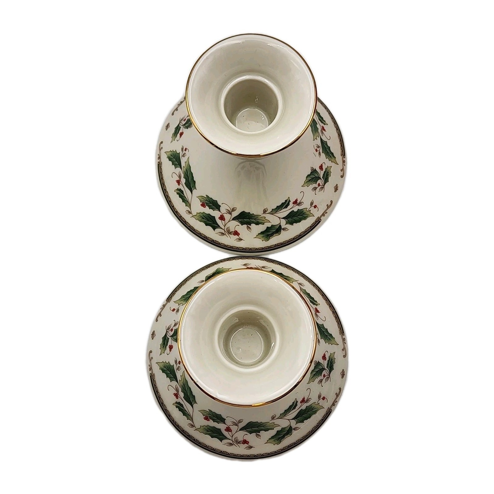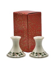 Royal Limited Holly Holiday Pair 4" Candle Holders Porcelain Gold Trim in Box