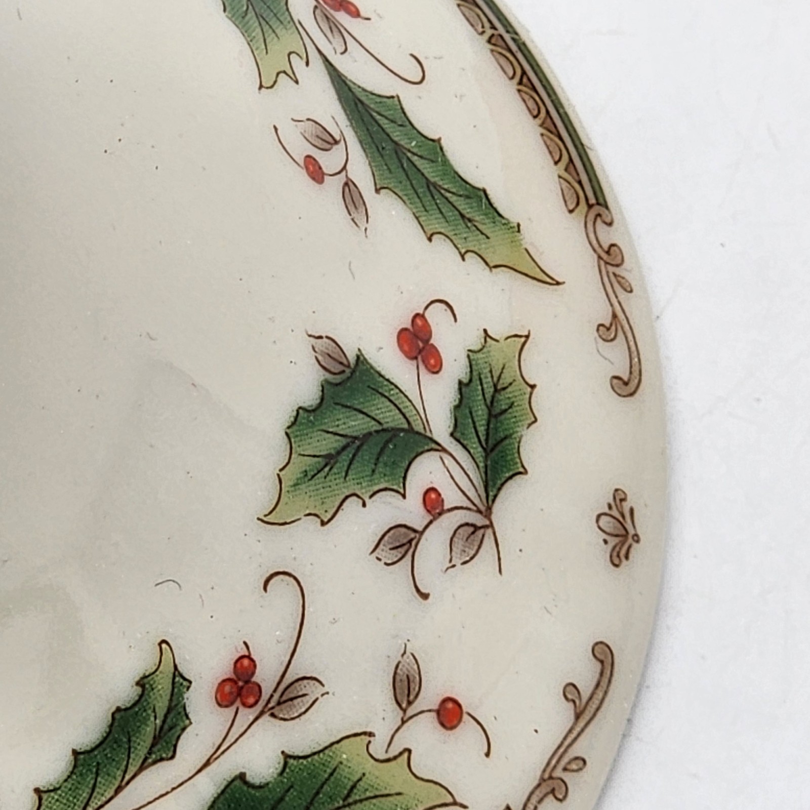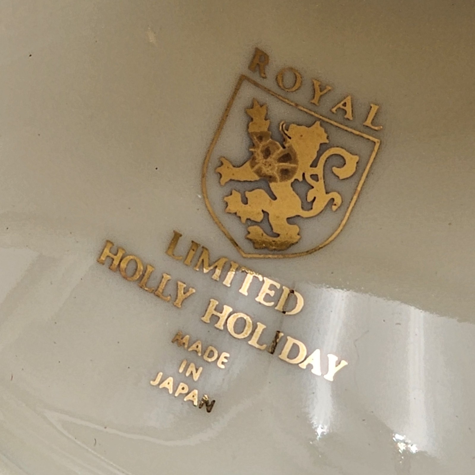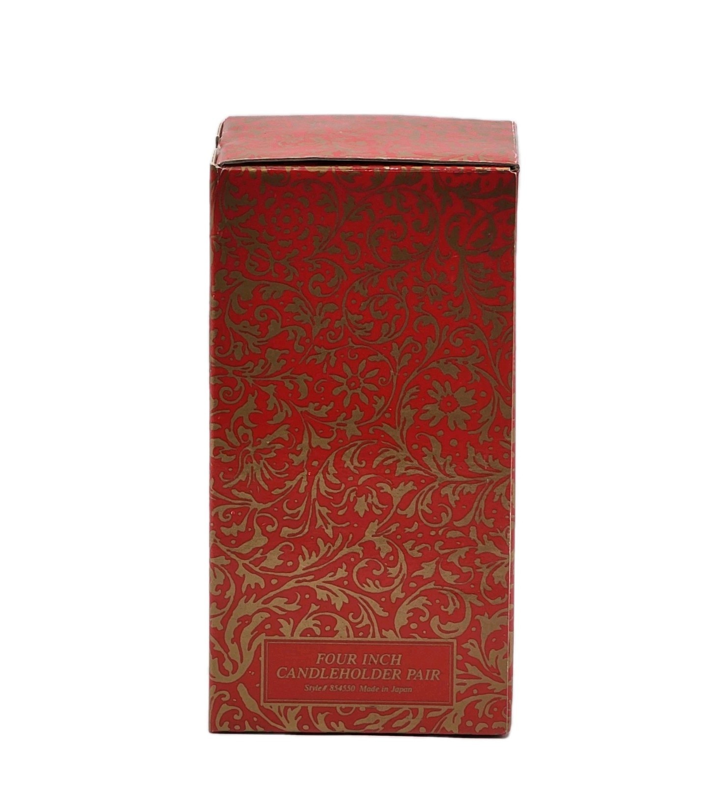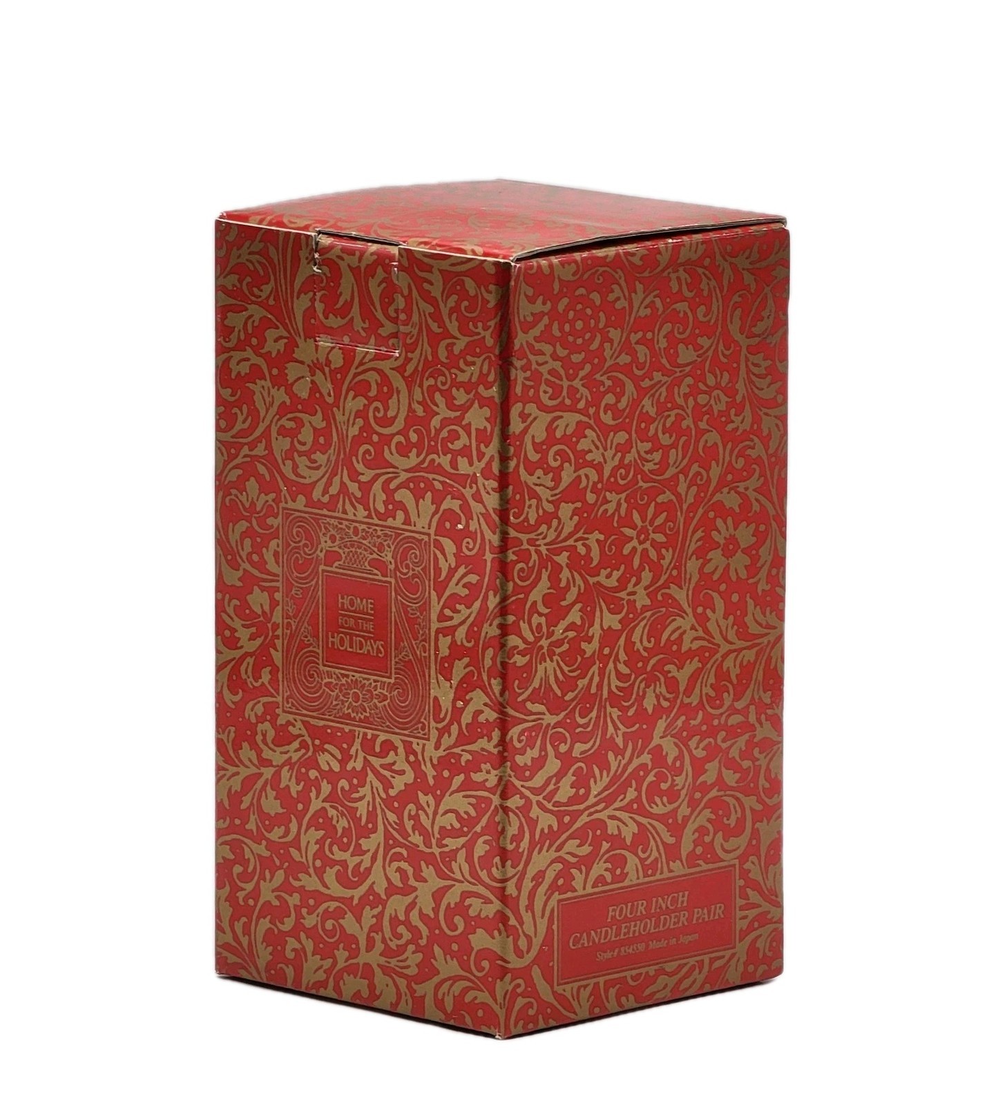 The Royal Limited Holly Holiday Pair 4" Candle Holders are a set of festive and elegant porcelain candle holders perfect for the Christmas season. Manufactured in 1987, these medium-sized candlesticks feature holly leaves and gold trim, adding a touch of seasonal charm to any home decor. The glossy multicolor finish and boxed packaging make them a collectible item that exudes a vintage 1980s style, making them a lovely addition to any adult's holiday celebration. Made in Japan, these candle holders are a beautiful representation of the traditional Christmas theme.