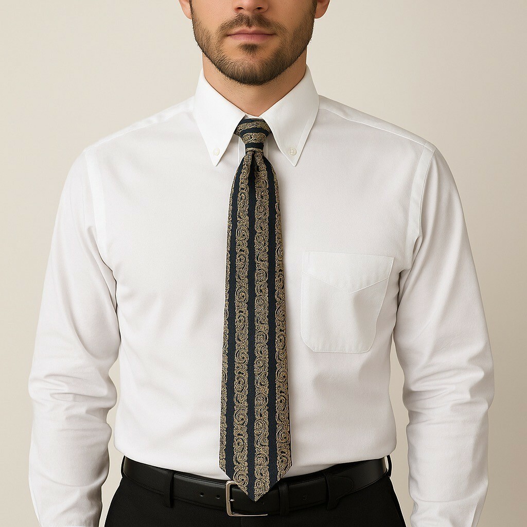 Classic Claiborne men?s tie featuring an elegant baroque-inspired stripe design in gold on a deep navy background. Made from smooth woven silk, this timeless accessory adds a refined touch to any dress shirt or suit?perfect for professional or formal wear.