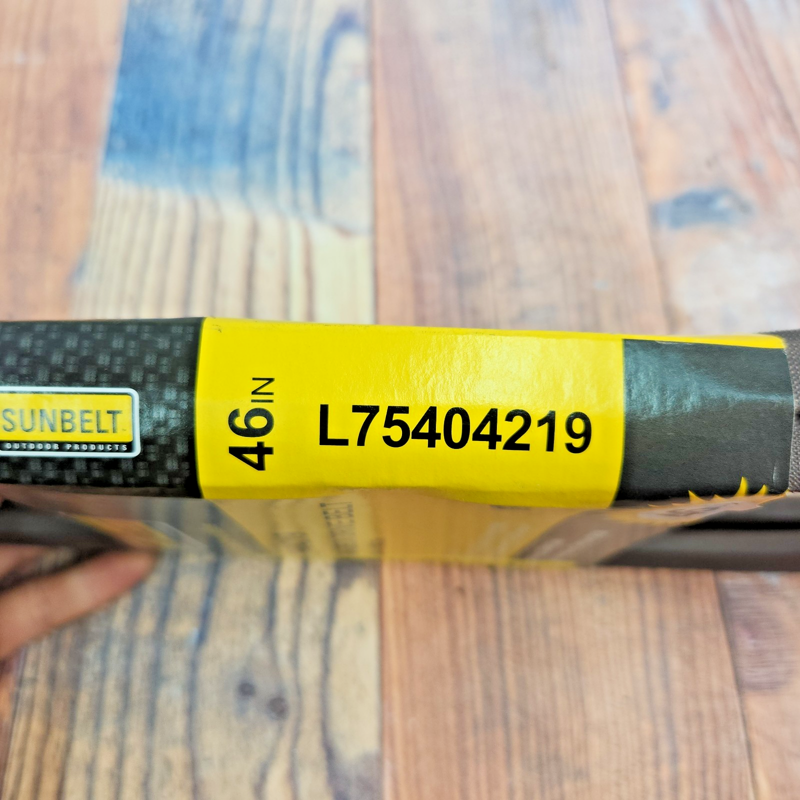 The Sunbelt L75404219 drive belt is a high-quality replacement part designed for MTD, Cub Cadet, and Craftsman lawn mowers with a 46" deck. Made of durable rubber and measuring 1/2" in diameter and 103.25" in length, this black belt is compatible with a universal range of models. With a horsepower rating of 12 HP and a 12V voltage, this belt is a reliable choice for maintaining the performance of your lawn mower. Manufactured in India by Sunbelt, this belt comes with a California Prop 65 warning related to cancer and reproductive harm.