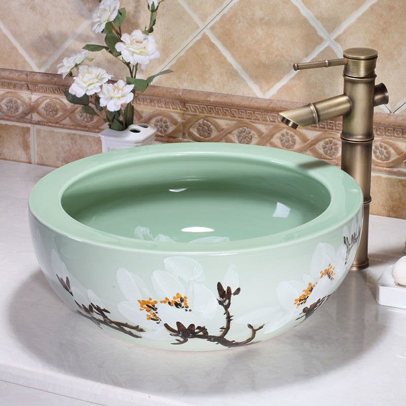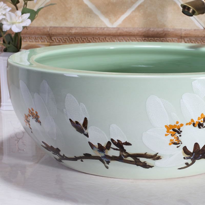 Product description: Transform your bathroom into an artistic sanctuary with this exquisite Interoknack Hand Painted Glaze Pea Green Round Art Basin. Each vessel sink features delicate plum blossom motifs meticulously hand-painted against a serene pea green background, creating a stunning focal point for any vanity. Crafted from high-fired porcelain, this countertop sink offers exceptional durability and scratch resistance while maintaining its vibrant color through years of use. Measuring 16.1 inches in diameter and 5.9 inches in height, this spacious round basin provides both elegant aesthetics and practical functionality. The sink accommodates standard above-counter installation and fits typical 1.77-inch drain openings (drain sold separately). Perfect for modern homes, boutique hotels, or designer renovation projects, this ceramic art basin seamlessly blends Asian-inspired artistry with contemporary bathroom design. Elevate your daily routine with this unique combination of beauty and function.