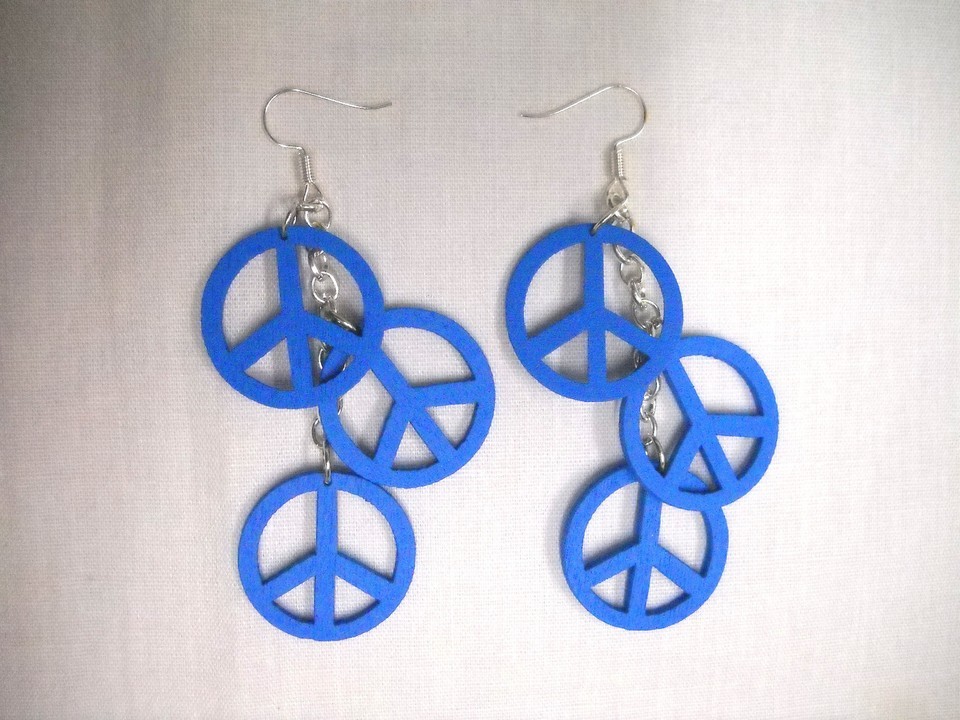 NEW MEDIUM BLUE 3 TIER WOODEN PEACE SIGN SYMBOL DANGLING ON CHAIN HOOK EARRINGS