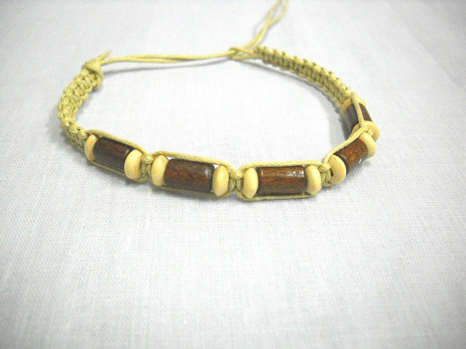 NATURAL LIGHT TAN COTTON CORD MACRAME WEAVE ANKLE BRACELET OR WRIST BRACELET WITH LIGHT TAN BROWN COLOR REAL WOODEN BEADS