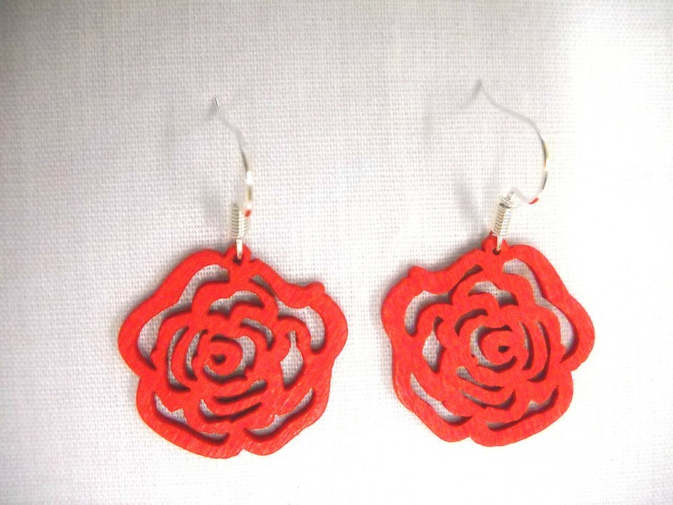 SMALL SIZE TRUE RED CUT OUT OPEN ROSE FLOWER WOODEN CHARM DROP EARRINGS