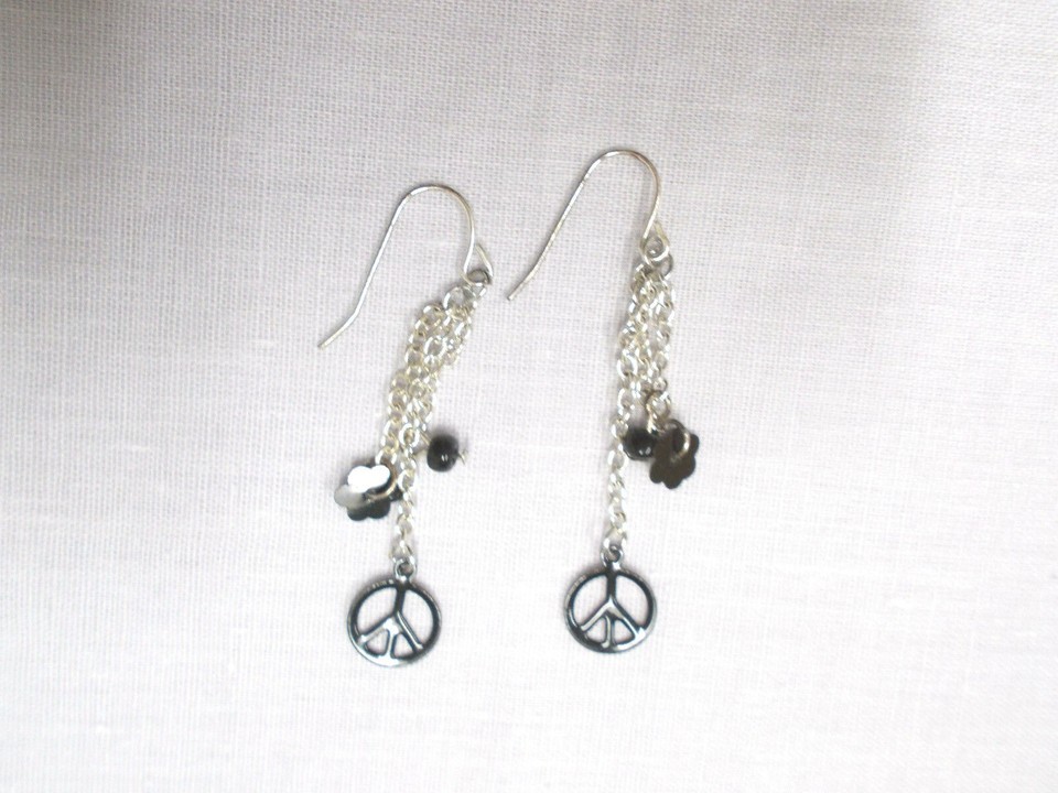 BLACK PEACE SIGN - FLOWER SEQUIN & SEED BEAD 3 CHAIN DANGLE PAIR OF EARRINGS