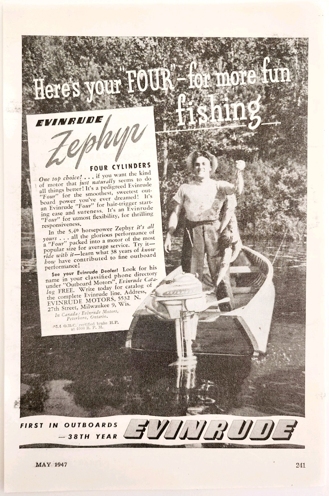 1947 Evinrude Zephyr Outboard Motor Advertisement Vintage Fishing Boating E8E