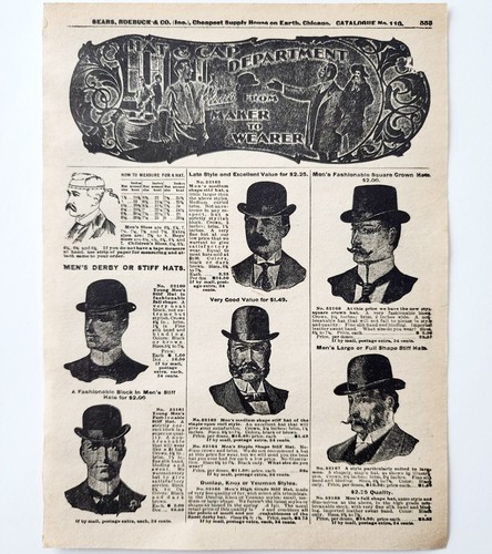 1900 Bowler and Derby Hats Advertisement Victorian Sears Roebuck 5.25 x 7"