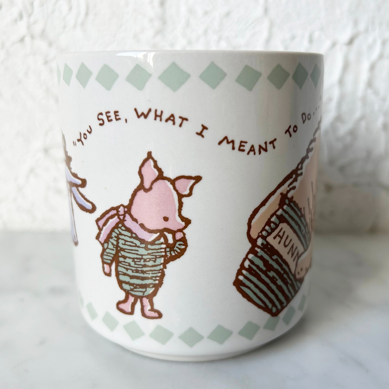 Classic Winnie the Pooh mug by the Walt Disney Company. Winnie the Pooh has his head in the Hunny pot saying You see, what I ment to do... with Piglet and Eeyore looking on. Coffee cup measures 3-1/4" across the top and is 3-1/2" high. Excellent condition with small manufacturing blemish shown in close up picture.