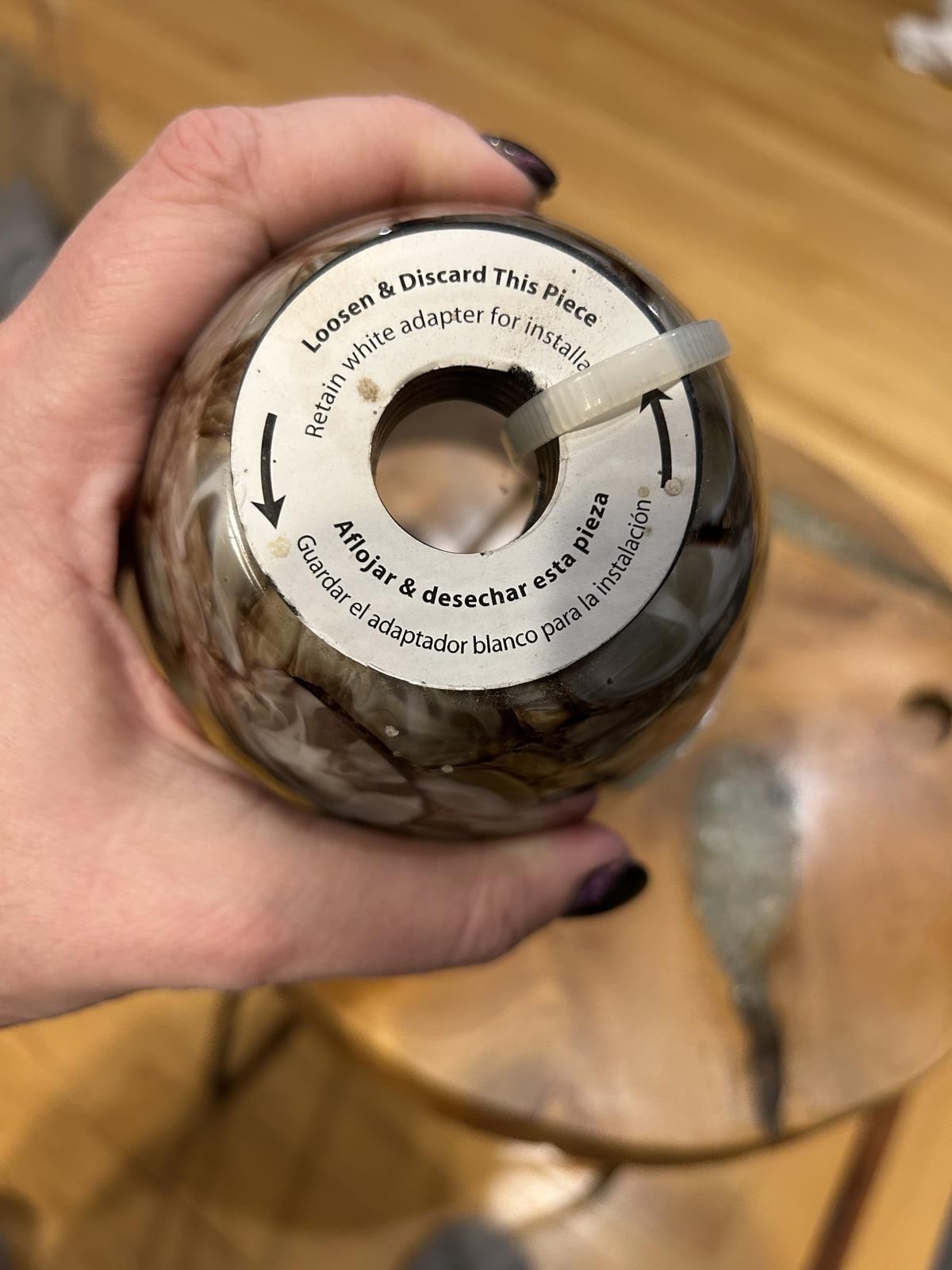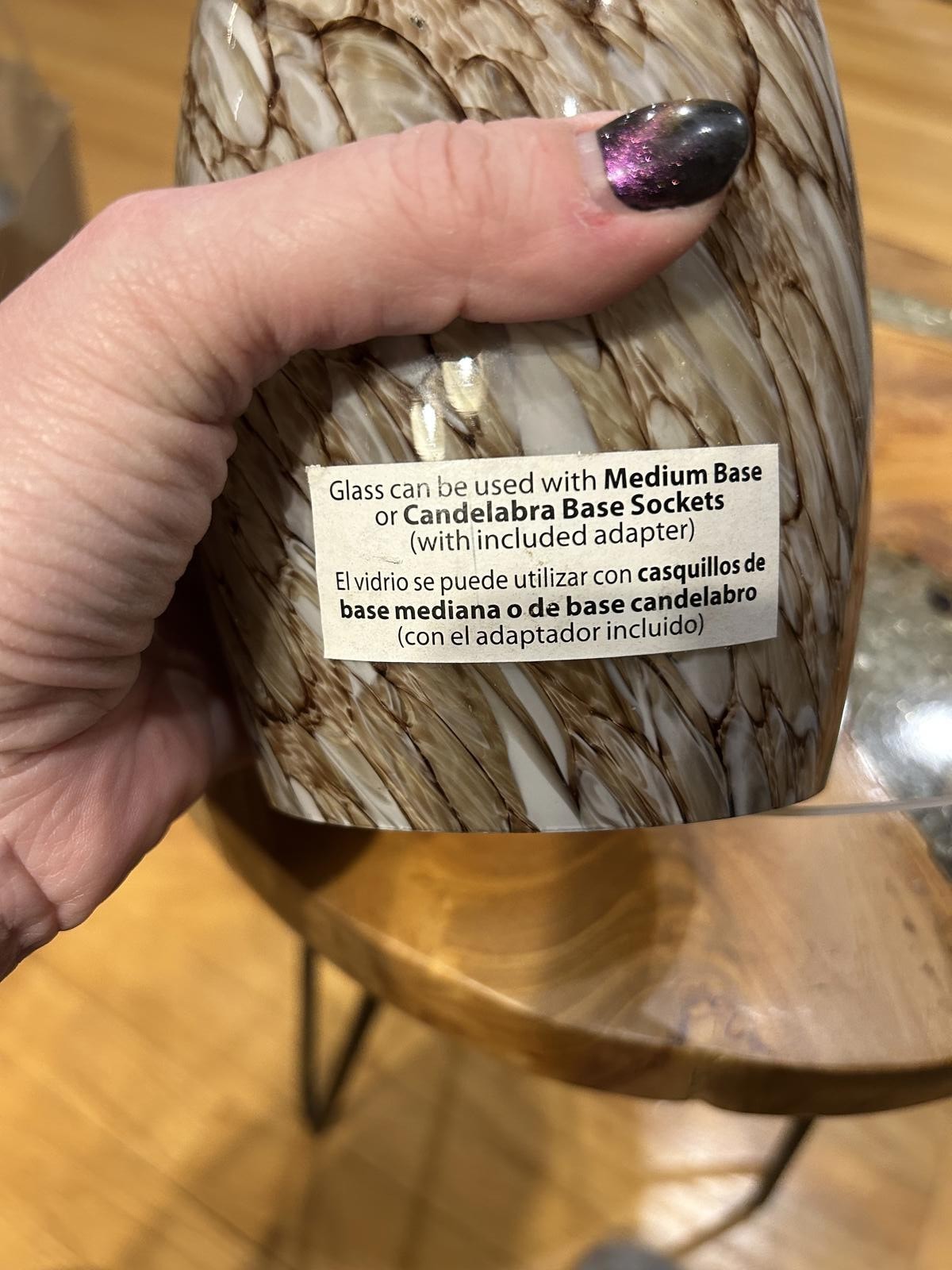 Glass lamp shade with a unique brown and cream marbled design.