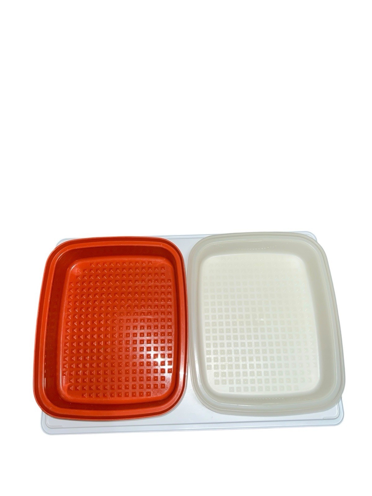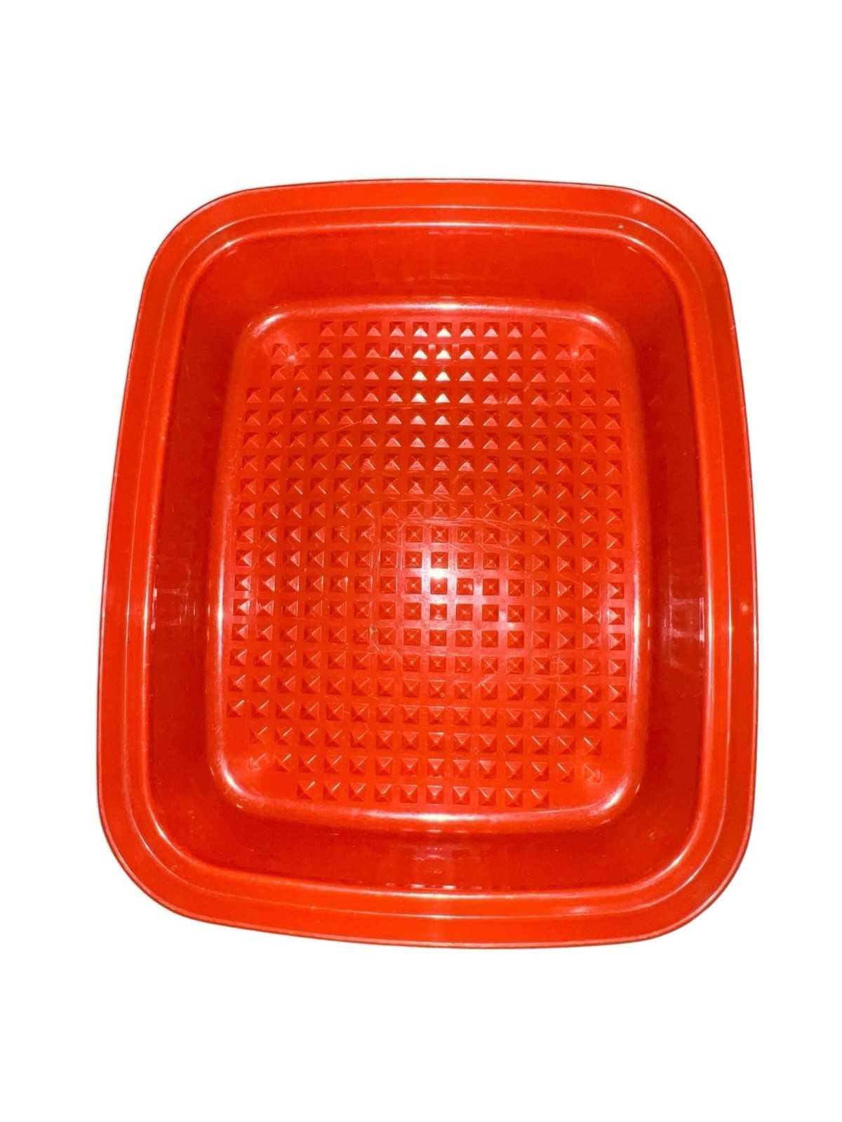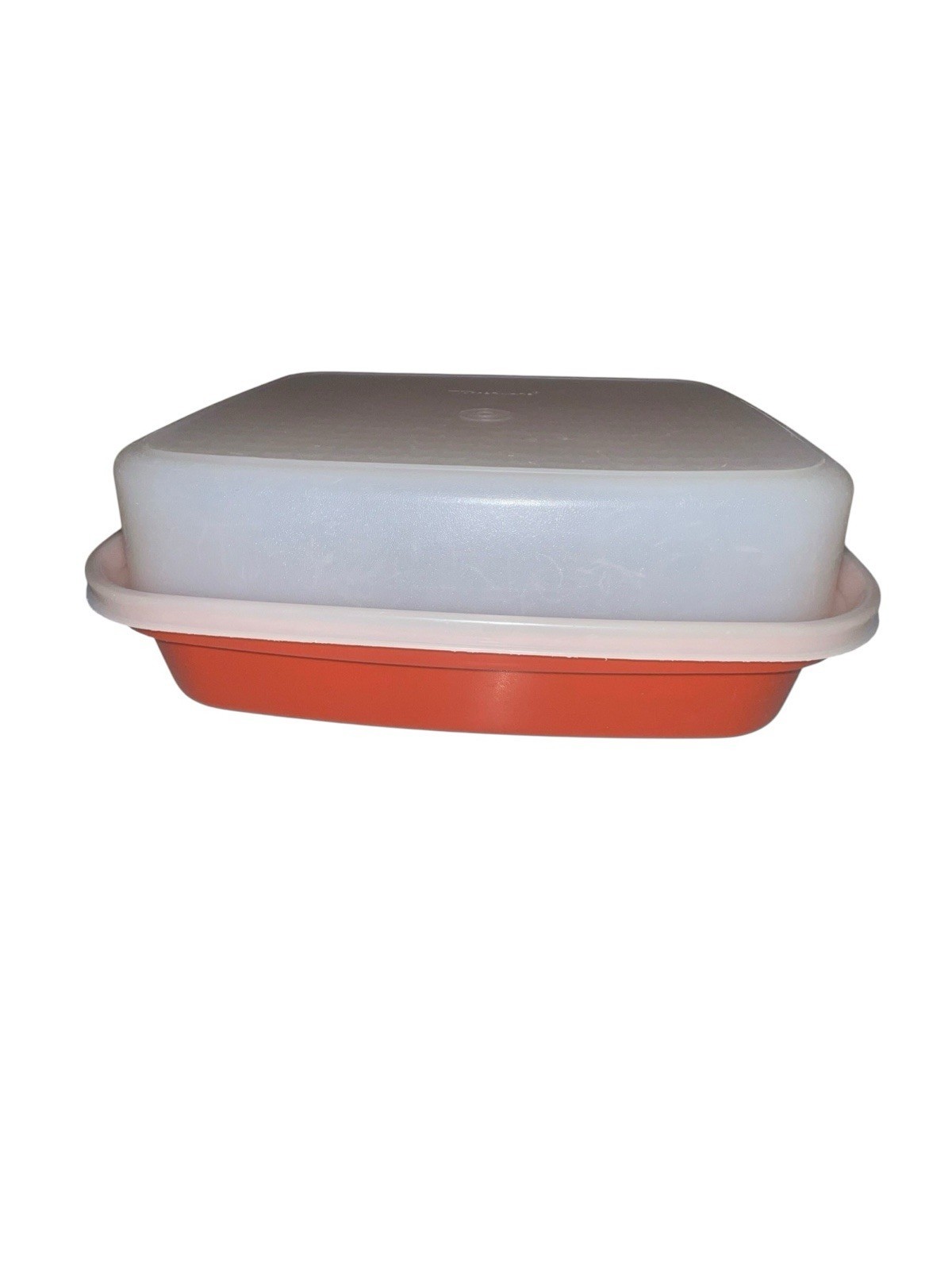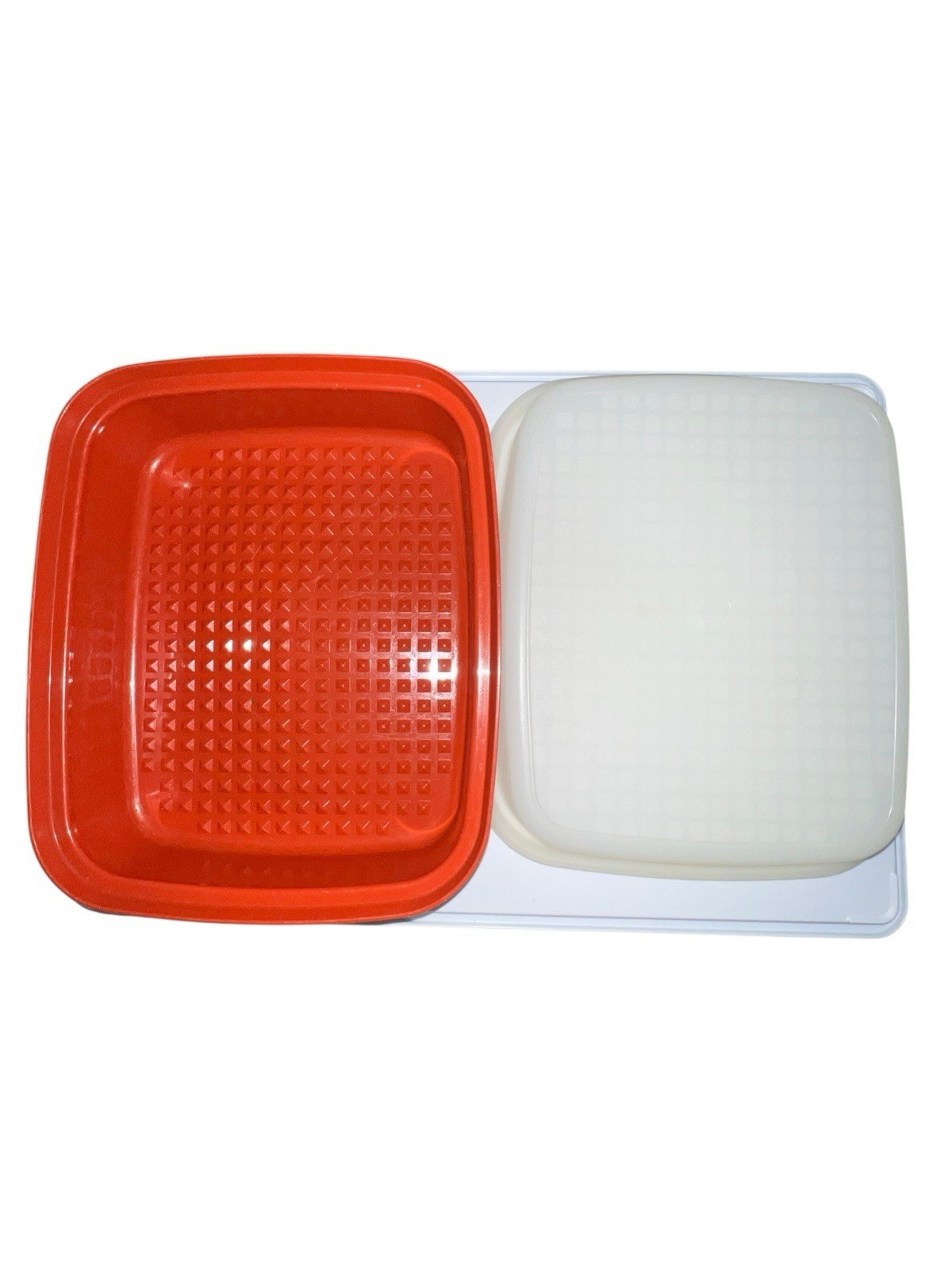 This vintage Tupperware meat marinade storage container set includes a large 12" rectangular container with a snap lid. The container is in a paprika red color and is made of plastic. It has a vintage retro style and features a Season Serve Diamond Waffle Bottom design. This original Tupperware item from the United States is perfect for storing and marinating meats in the refrigerator, making it a convenient addition to any kitchen storage and organization collection.