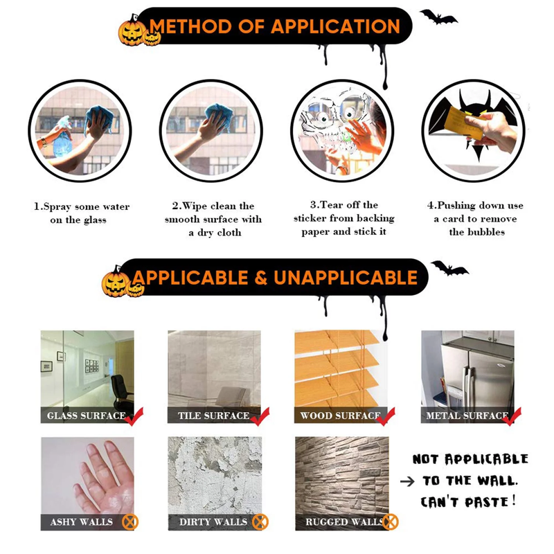 SPOOKY DESIGN ELEMENTS: Includes 6 sheets of Halloween window clings featuring bats, ghosts, and skeletons to create a spooky atmosphere in your home. PREMIUM MATERIALS: Made of eco-friendly PVC, these Halloween window stickers are waterproof, reusable, and easy to apply without leaving sticky residue. EASY TO APPLY: Simply clean the surface, peel off the Halloween window clings, and stick them to smooth, wet surfaces for a seamless Halloween decoration. VERSATILE USE: Ideal for windows, doors, mirrors, and other smooth surfaces, these Halloween window decorations will give your home a spooky touch this Halloween. CREATIVE HALLOWEEN DECOR: Featuring fun designs like skeletons and ghosts, these Halloween window stickers add the perfect creepy vibe to your Halloween parties or indoor decor.