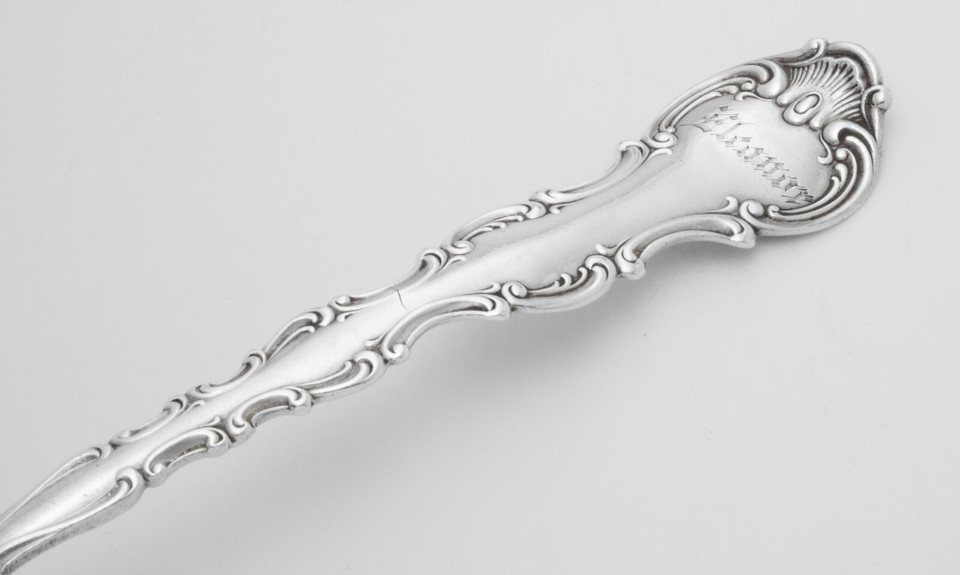 CONDITION: Good. There are minor dents in the bowl of the spoon, it has fine scratches from use and there is a hairline crack on the the handle that can be buffed out and repaired by a silversmith. See photos. Spoon has been cleaned and polished and looks really nice and will give you years of use. I inherited the spoon from my grandmother.