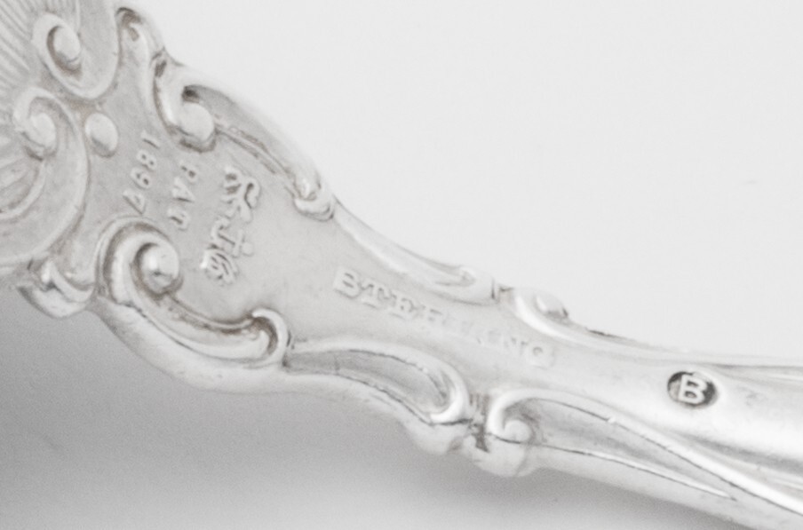 PIECE HAS A STAMPED HALLMARK " There are 3 symbols, The Lyon Passant, guardant, and the Date Mark, plus the word STEARLING. There is also a circle with a B in the center. There is a monogram Elenore on the tip.