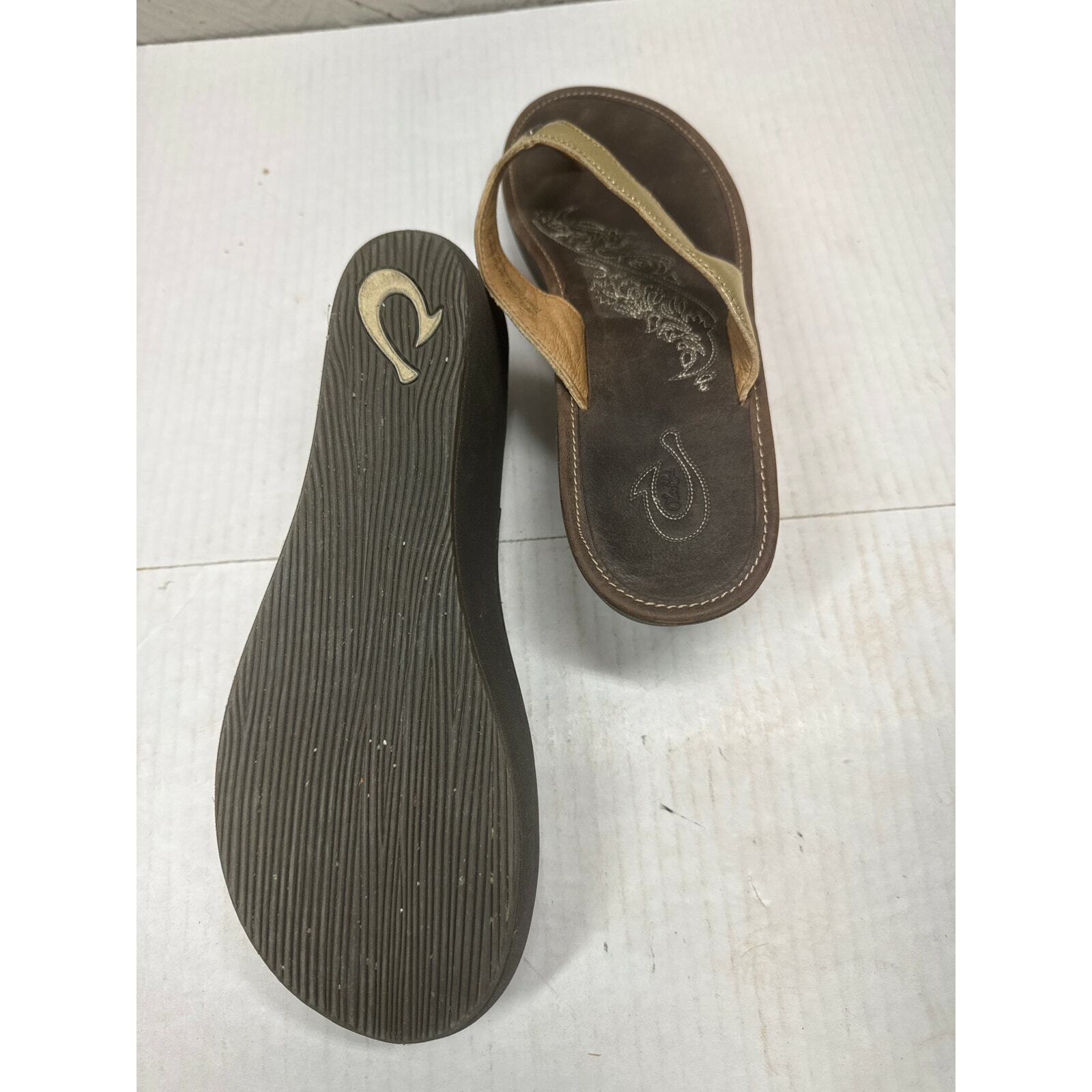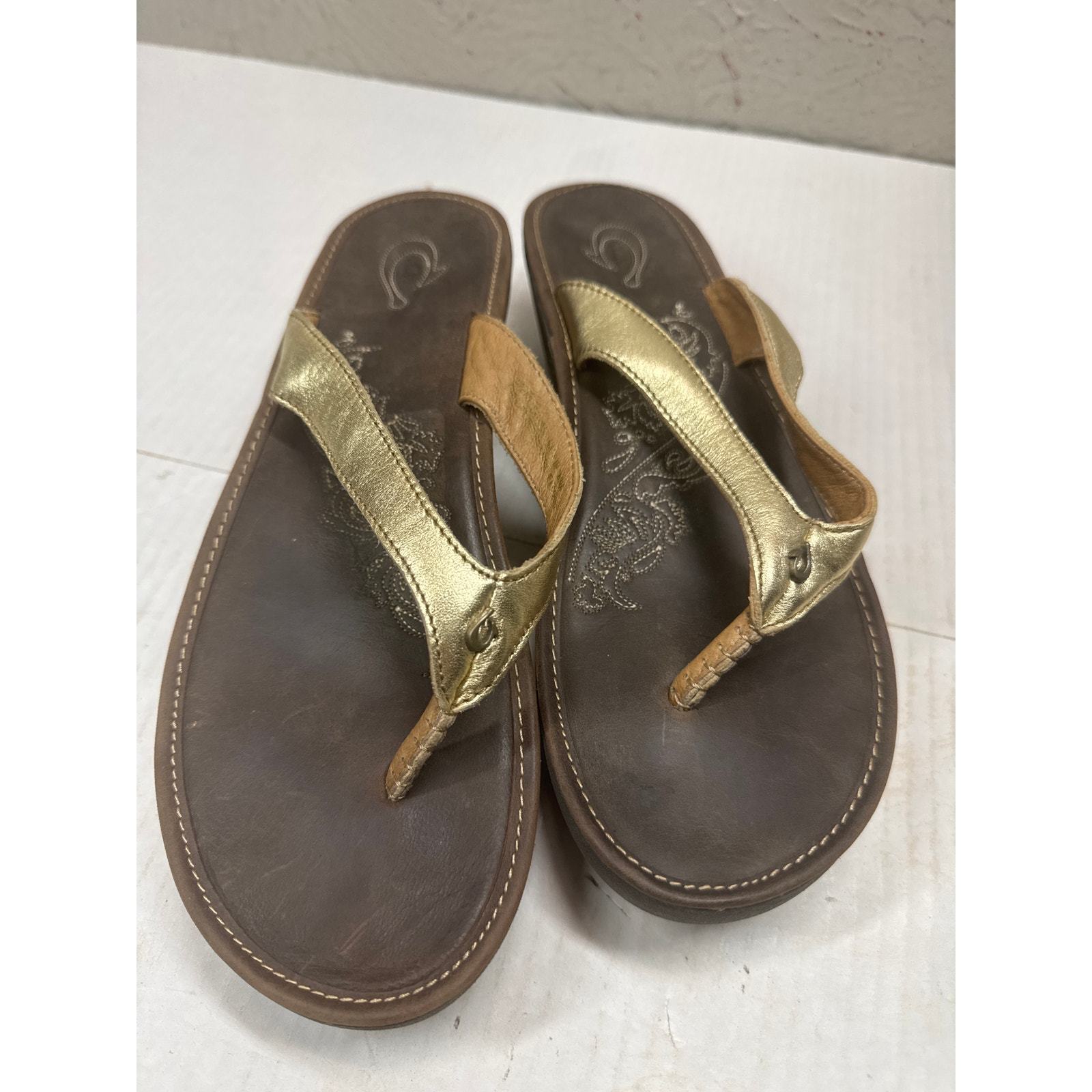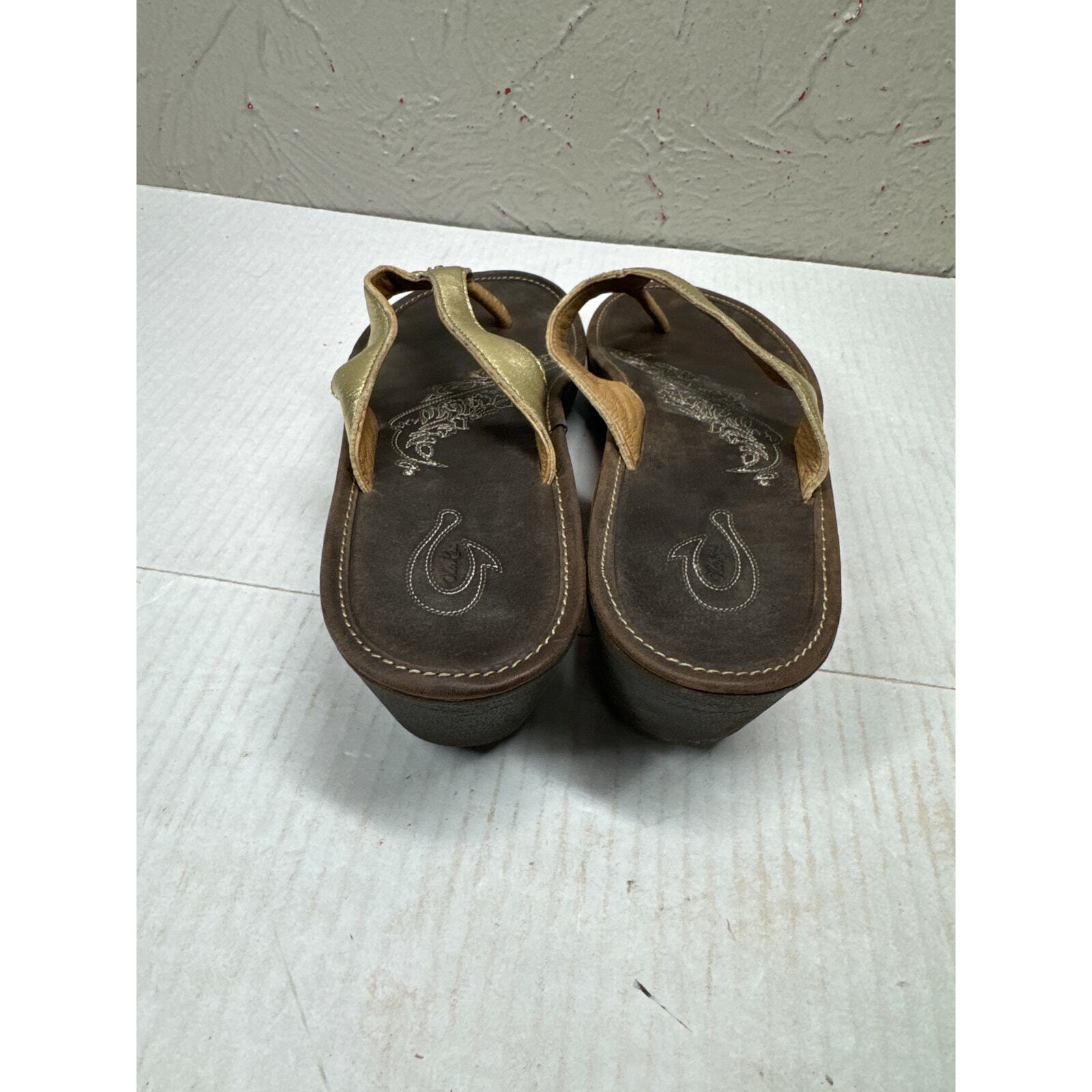 OluKai Paniolo II Brown Gold Leather Wedge Thong 20133-5048 Womens Size 9 EU 39