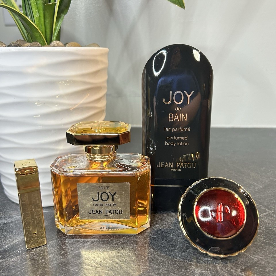 Vintage Jean Patou Eau De Joy EDP 2.5 Spray Perfume, .13 oz Solid Perfume SEALED, 3.4 oz Perfumed Body Lotion Gold Travel Spray NEW.
