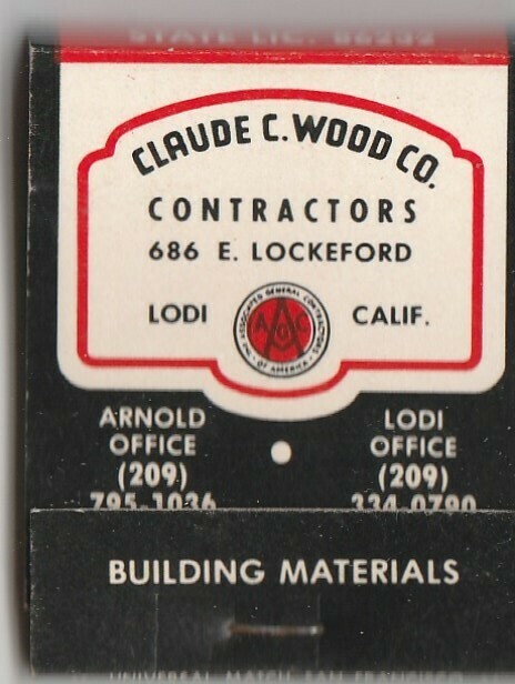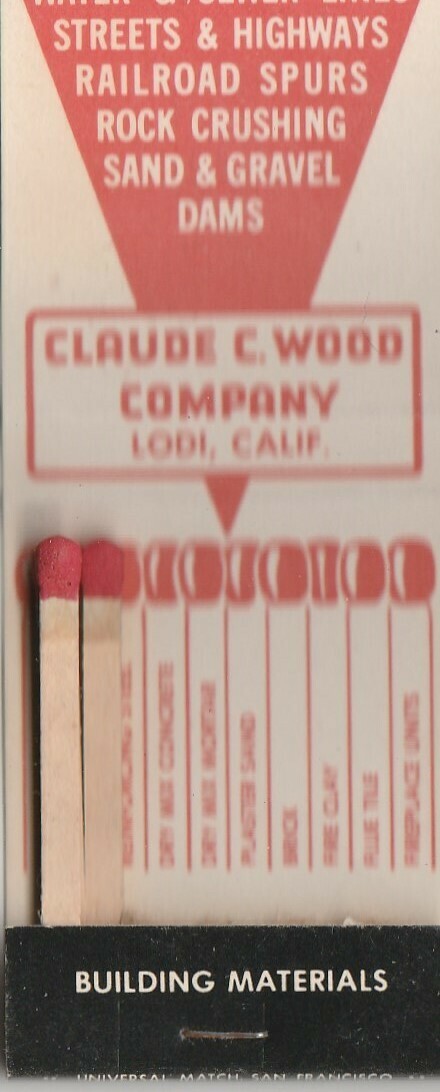 Vintage Strike on Matchbook ~ Claude C. Woods Co.Contractors ~ Lodi, Ca ~ Used