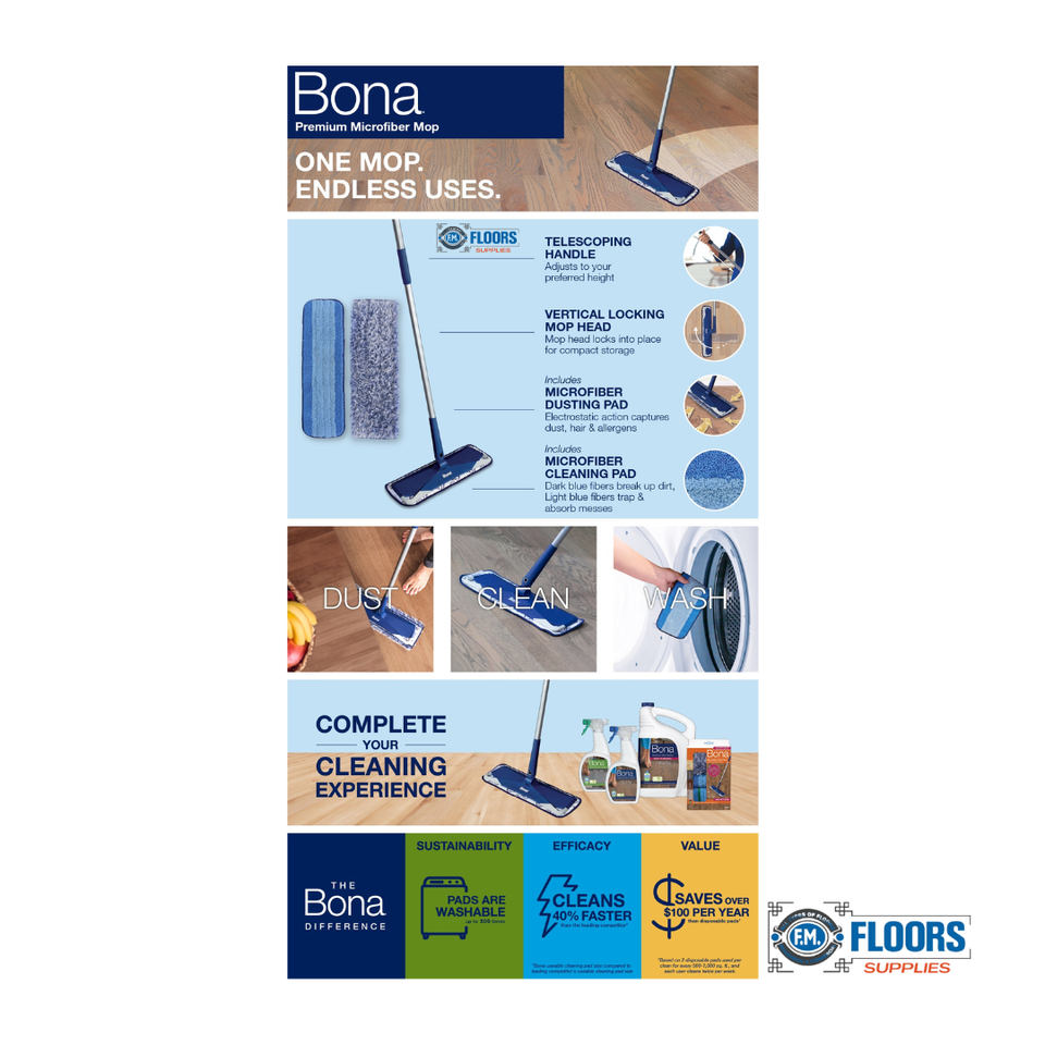Bona makes it easy to care for your floors. The Bona Premium Multi-Surface Sweep Clean Mop, with a durable telescoping mop pole and extra-large mop head, provides an easy and quick way to clean your floors. Rubberized and flexible corners protect furniture and baseboards from damage. The Bona Microfiber Mop comes with two washable and reusable microfiber pads. The Bona Microfiber Cleaning Pad features a patented design with dual zone cleaning action. The Bona Microfiber Sweeping Pad attracts dust, pet hair and household allergens. For best results, use with any of Bona's amazing floor cleaners. Love your floors with Bona. Sustainable solutions for a cleaner and healthier home. 3-in-1 sweep plus clean mop system: versatile floor cleaning tool that sweeps, cleans and polishes with one tool. Telescoping adjustable pole: tool adjusts from 34 in. to 52 in. high for comfortable cleaning Extra-large mop head: clean quicker and easier Rubberized flexible corners: protect baseboards and furniture from dings and scratches Vertical locking mop head: stores easily in compact spaces Includes microfiber cleaning pad: patented dual-zone design lifts and removes stubborn dirt and grime, made of 90% PCR material Includes microfiber dusting pad: electrostatic action attracts dust, pet hair and household allergens, made of 90% PCR material Sustainable design: microfiber pads are reusable and washable up to 500 times Part of the Bona system: use with any Bona cleaner or polish for the ultimate clean and shine Packaging may vary