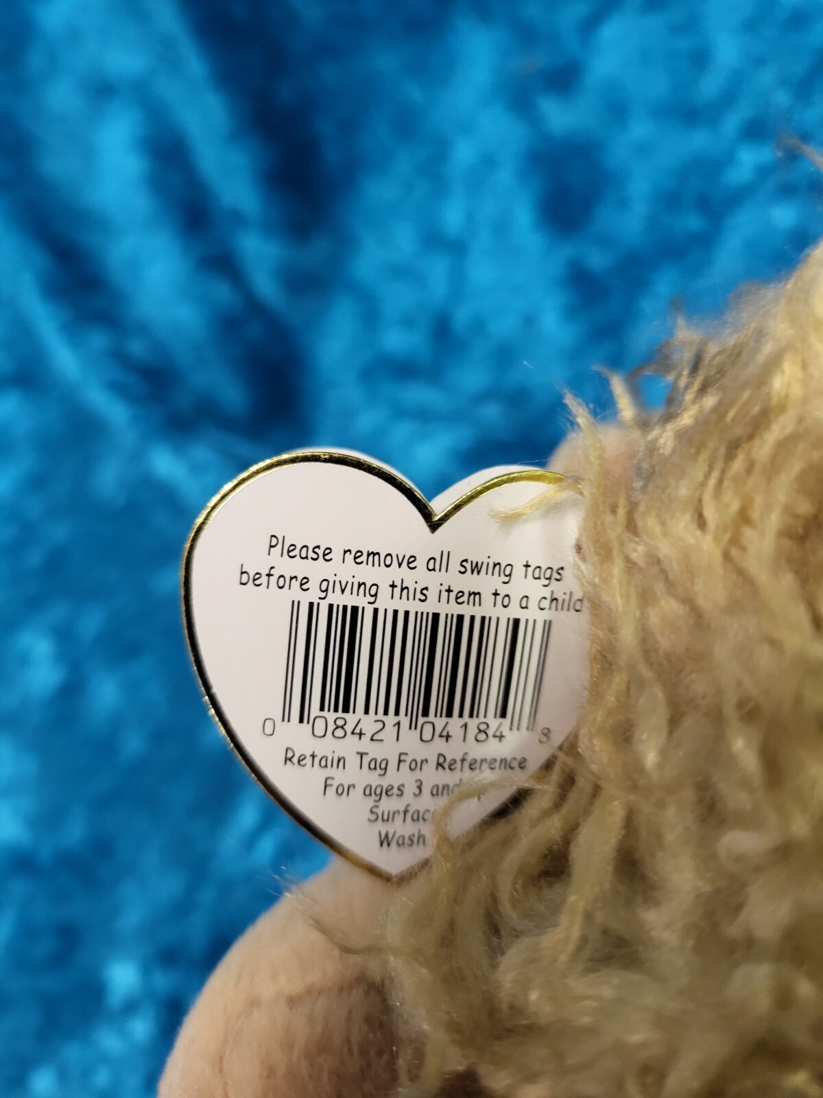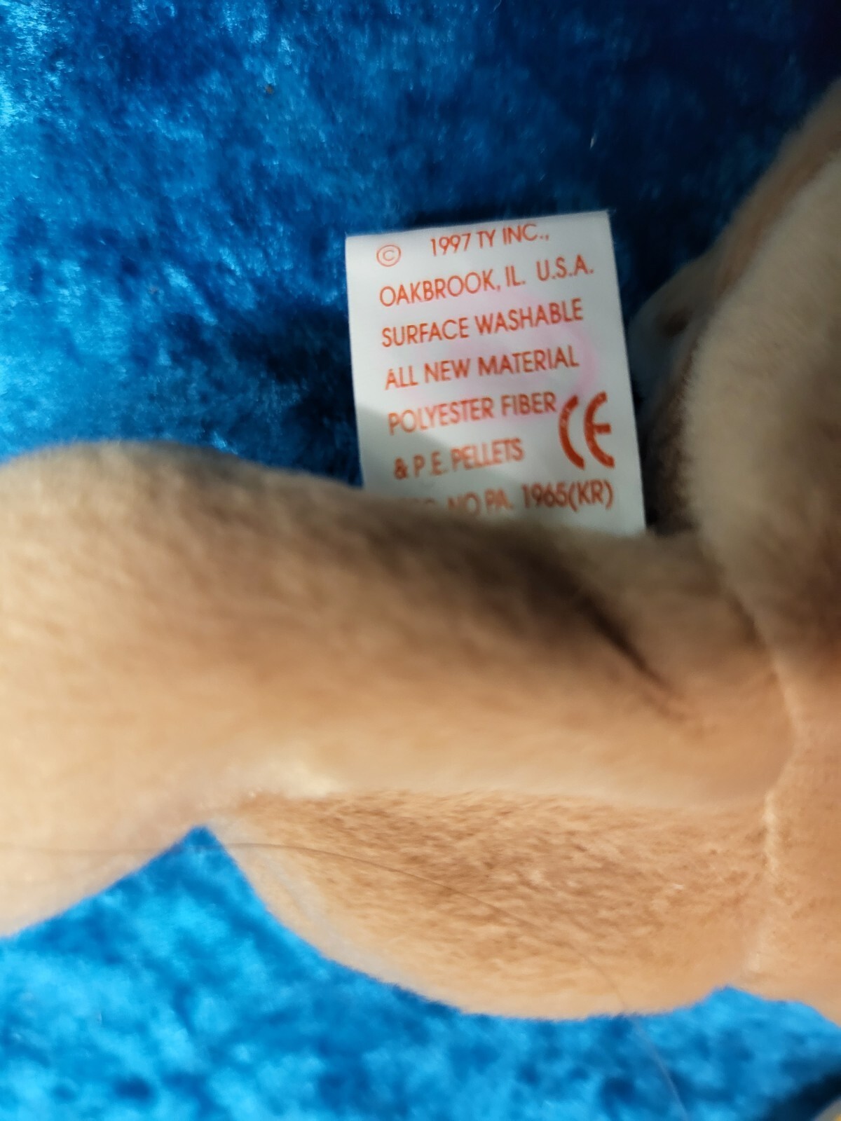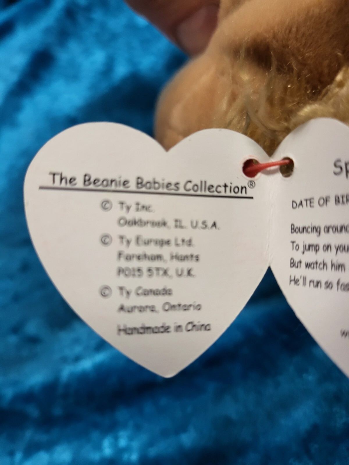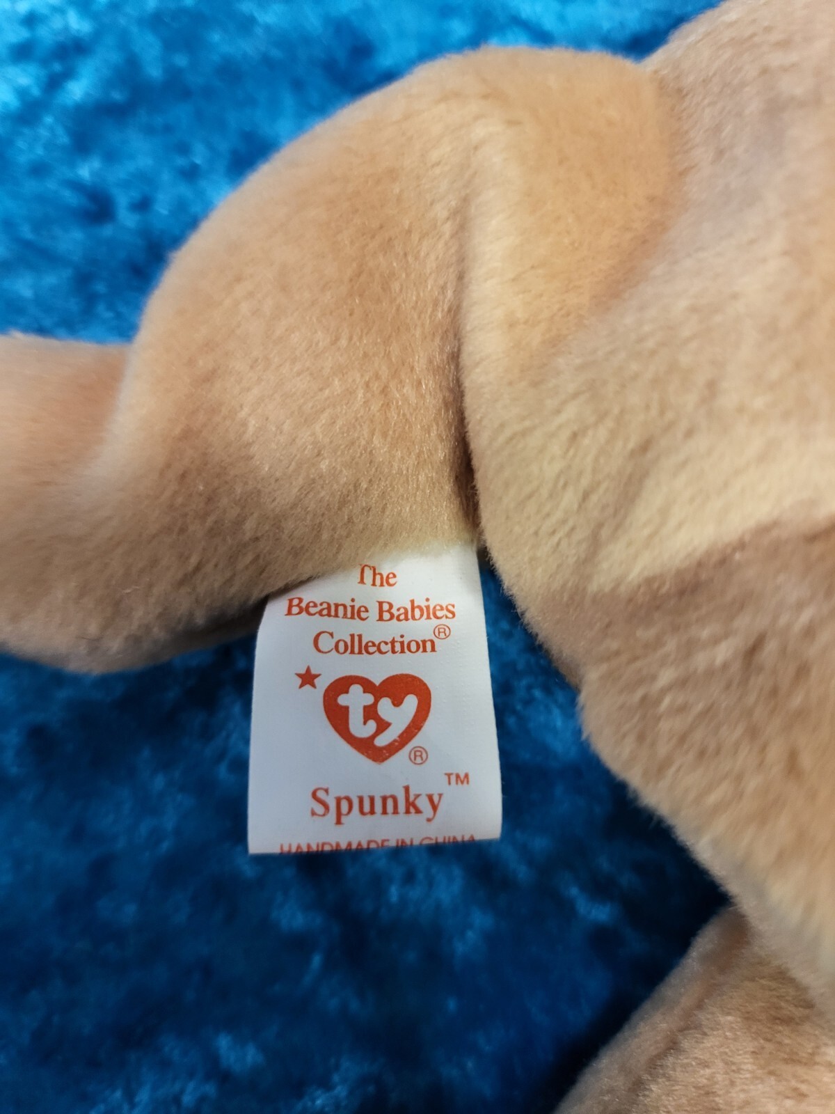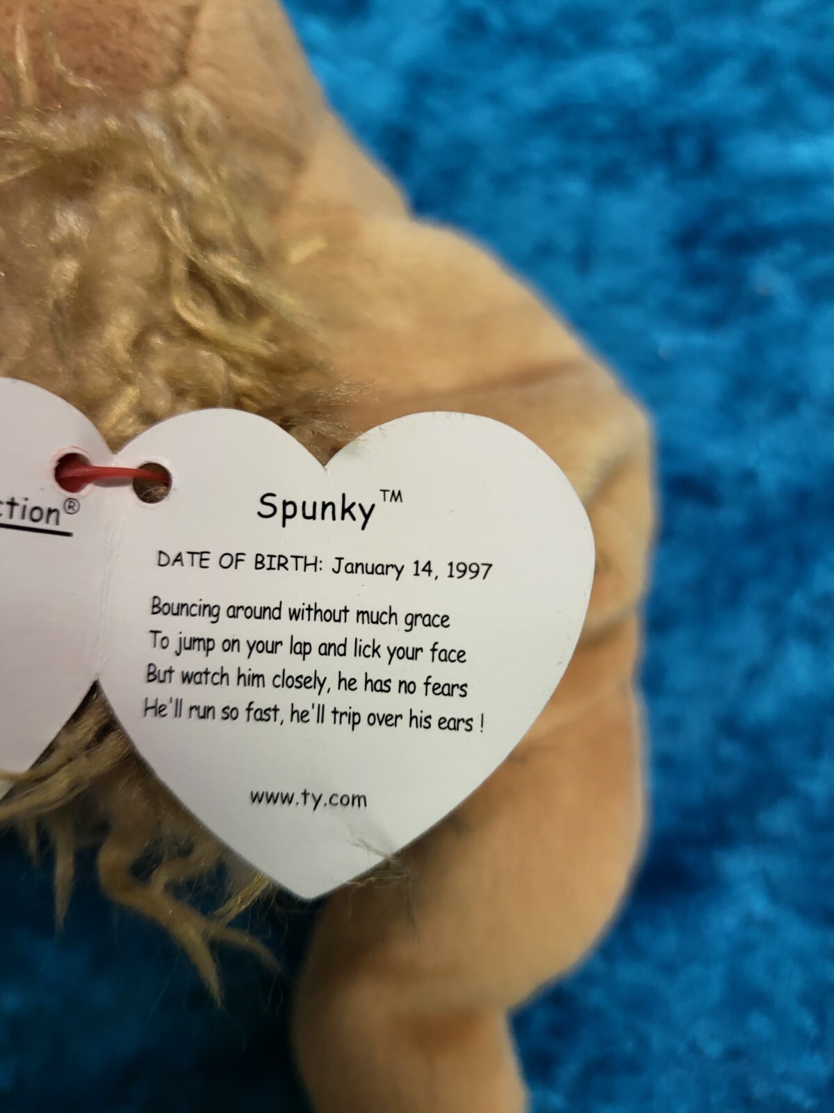 The product is a vintage Ty Beanie Baby named Spunky the Cocker Spaniel, born on January 14, 1997. This collectible toy is part of the original Beanie Babies line and comes with its original tags. Made in China, this plush toy is recommended for children aged 3 and older. With its nostalgic charm and classic design, this Beanie Baby would make a great addition to any collector's inventory.