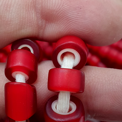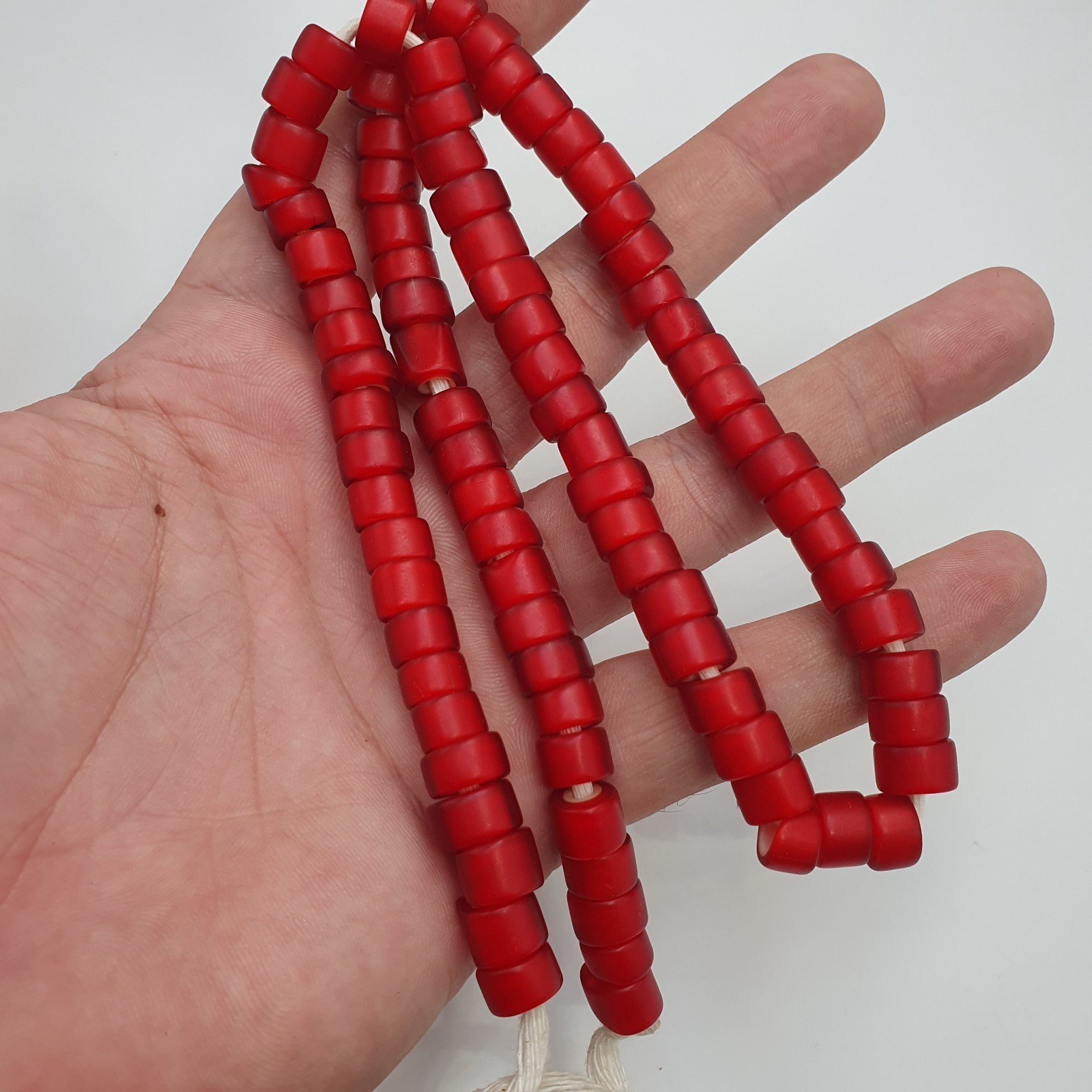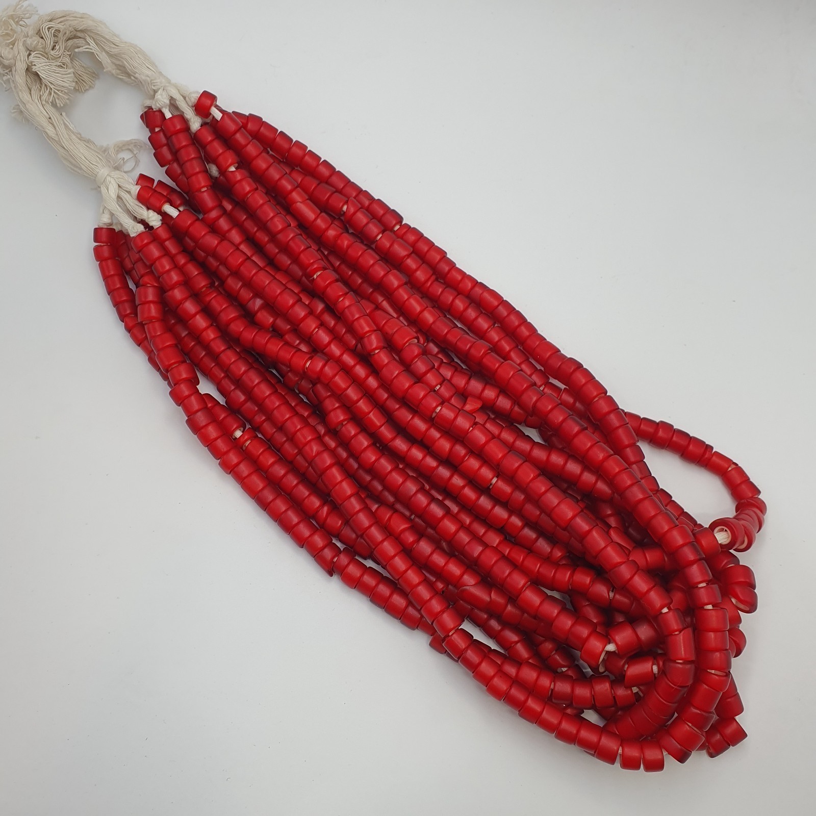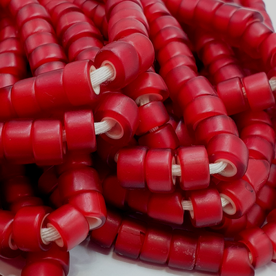 Realizzata nel tradizionale stile veneziano, ogni perla presenta un ricco esterno in vetro rosso traslucido con un caratteristico nucleo bianco, che simboleggia purezza e profondita. Queste perle erano una volta scambiate in tutta l'Africa e l'Asia, rendendole manufatti preziosi nel mondo della gioielleria antica e dell'ornamento culturale.