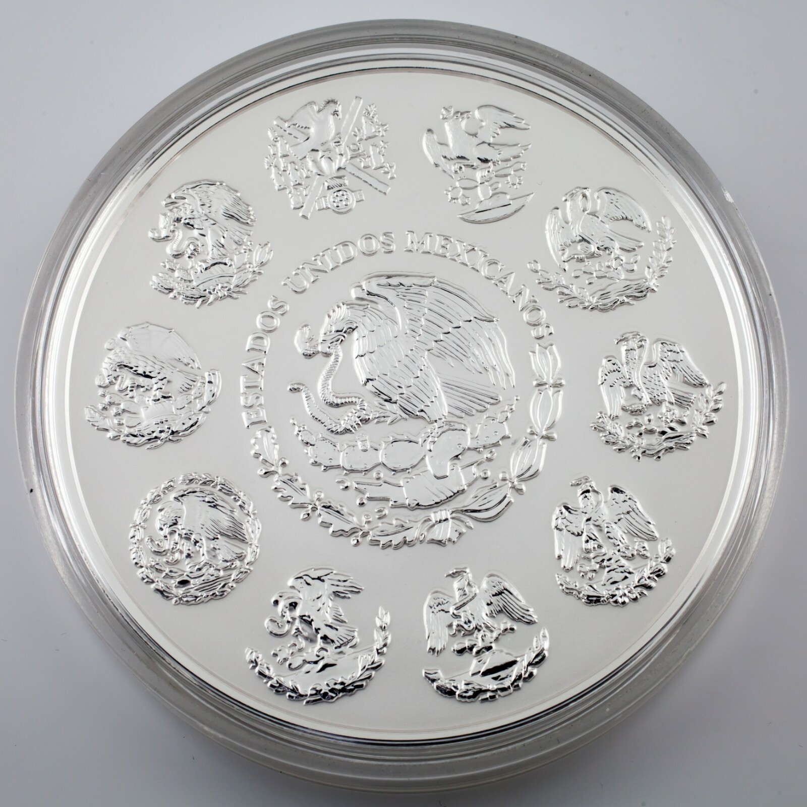 Avers: Au centre se trouve un relief sculptural du Bouclier national entoure de la legende "ESTADOS UNIDOS MEXICANOS" (ETATS-UNIS DU MEXICAIN). Autour de cela, suivant le bord du cadre de la piece, se trouvent des reproductions des differents boucliers nationaux utilises tout au long de l'histoire du Mexique, comme l'aigle qui apparaît au centre de la premiere page du Codex Mendoza. Le bord de la piece est plat.