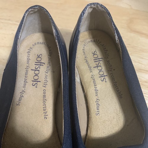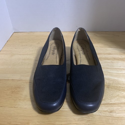 Elevate your style with these Softspots women's blue low heeled slip-on leather shoes. The closed toe design and rubber outsole make them perfect for both casual and business occasions. The shoes are made of leather with a fabric lining and insole for added comfort.