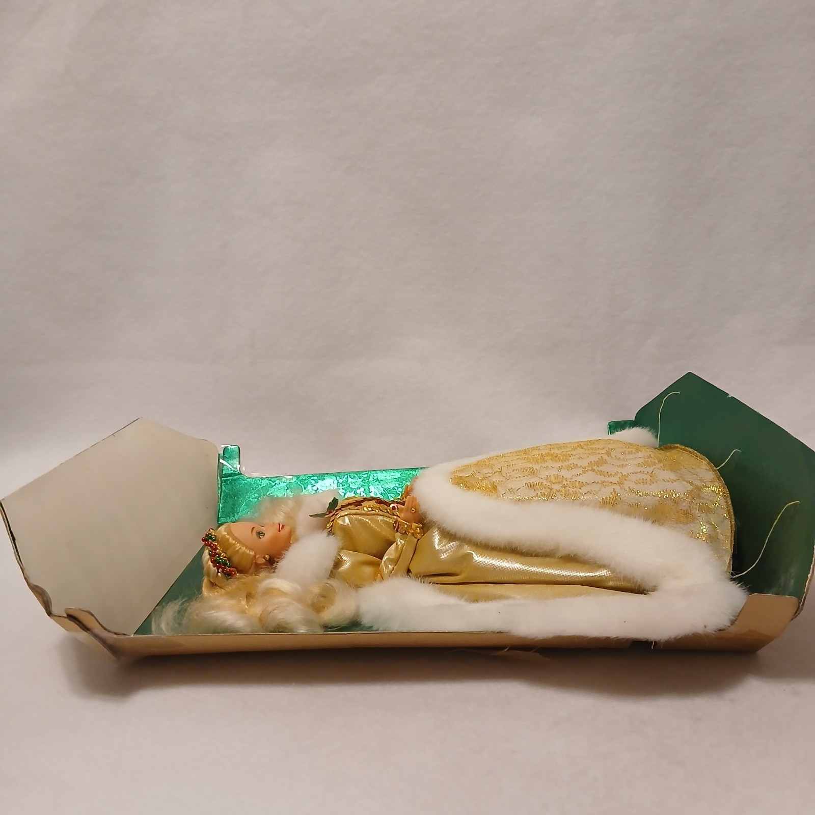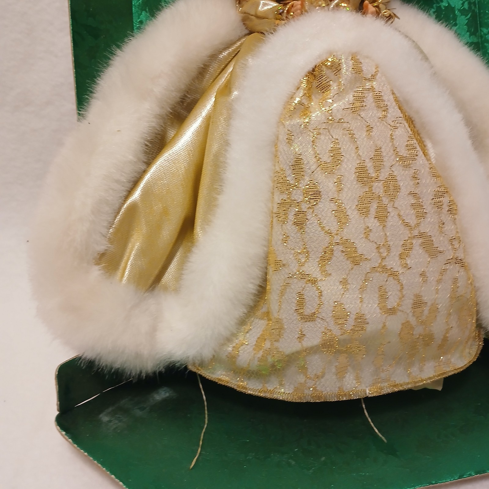 This listing is for a Special Edition 1994 Happy Holidays Barbie doll. This doll features Barbie wearing an elegant gold winter dress with simulated fur. The doll is very good and is missing the box. It was made in 1994 and is recommended for ages 3 and older.