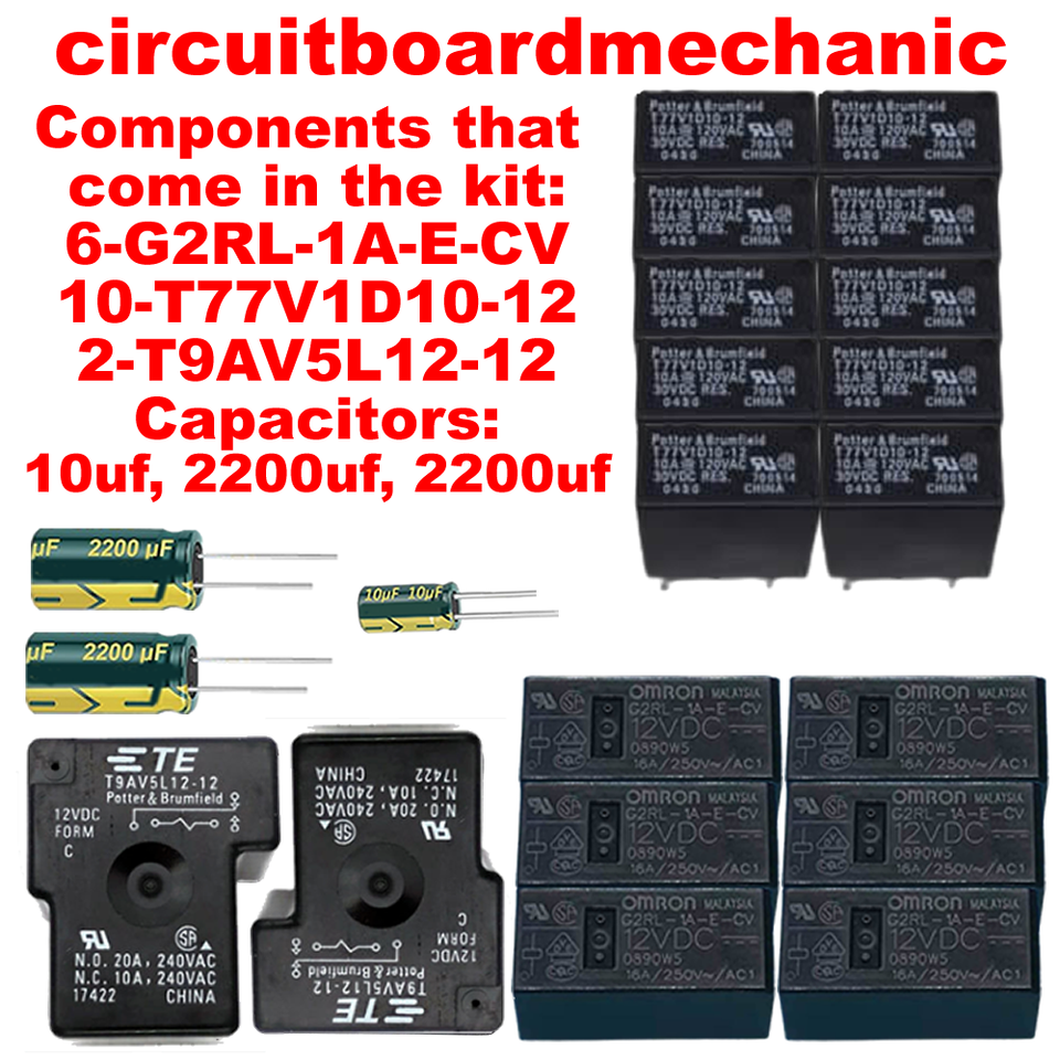 Comes with 20 relays and 3 capacitors components that repair 99% of all control boards. You must know how to solder with a soldering iron and you must know the correct orientation to install the parts. Capacitors and resistors only go one direction so don't install them backwards b/c they will not work 502525