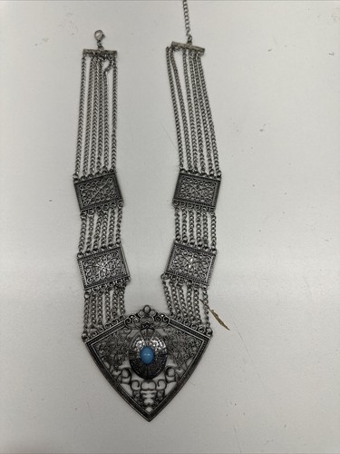 Add a touch of vintage charm to your wardrobe with this stunning Faux Silver Tone Metal Fringe Teal Stone Bib Necklace. The necklace features a beautiful teal color stone pendant and a silver tone metal chain with a link style. It also comes with a coin pendant/locket type and a collar/bib style.
