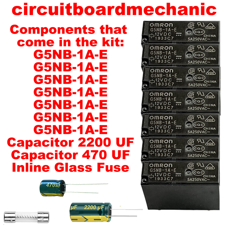 Components that come in the kit: G5NB-1A-E, G5NB-1A-E, G5NB-1A-E, G5NB-1A-E, G5NB-1A-E, G5NB-1A-E, G5NB-1A-E Capacitor 2200uf 470uf, 2200uf and Inline Glass Fuse