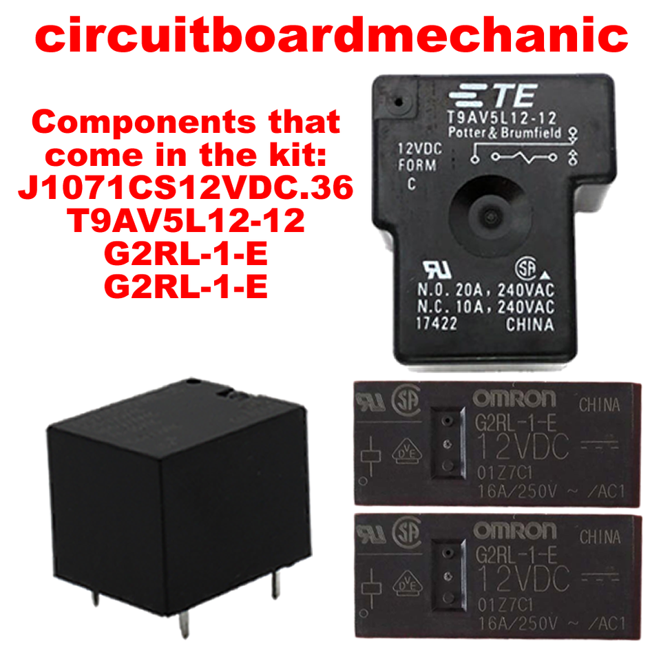 Relays that come in the kit: J1071CS12VDC.36, T9AV5L12-12, G2RL-1-E, G2RL-1-E