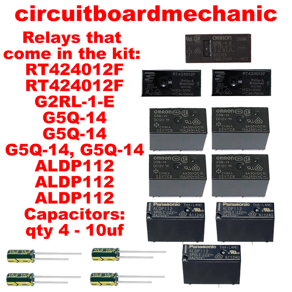 Relays that come in the kit: RT424012F, RT424012F, G2RL-1-E, G5Q-14, G5Q-14, G5Q-14, G5Q-14, ALDP112, ALDP112, ALDP112 4 capacitors 10uf