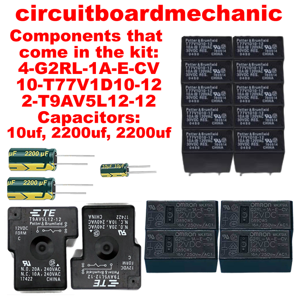 Components that come in the kit: Qty 4 - G2RL-1A-E-CV, Qty 10 - T77V1D10-12, Qty 2 - T9AV5L12-12 and Capacitors: 10uf, 2200uf, 2200uf