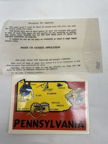 This is a vintage water transfer decal featuring a Pennsylvania state souvenir design. It is suitable for luggage and travel purposes. The product was manufactured in the United States and is not handmade.