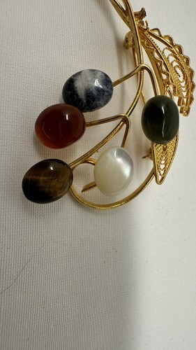 This beautiful vintage brooch pin features a delicate leaf shape adorned with multicolor acrylic stones. The piece is signed and measures 2 inches in length. The setting style is prong and the materials used are metal and acrylic.