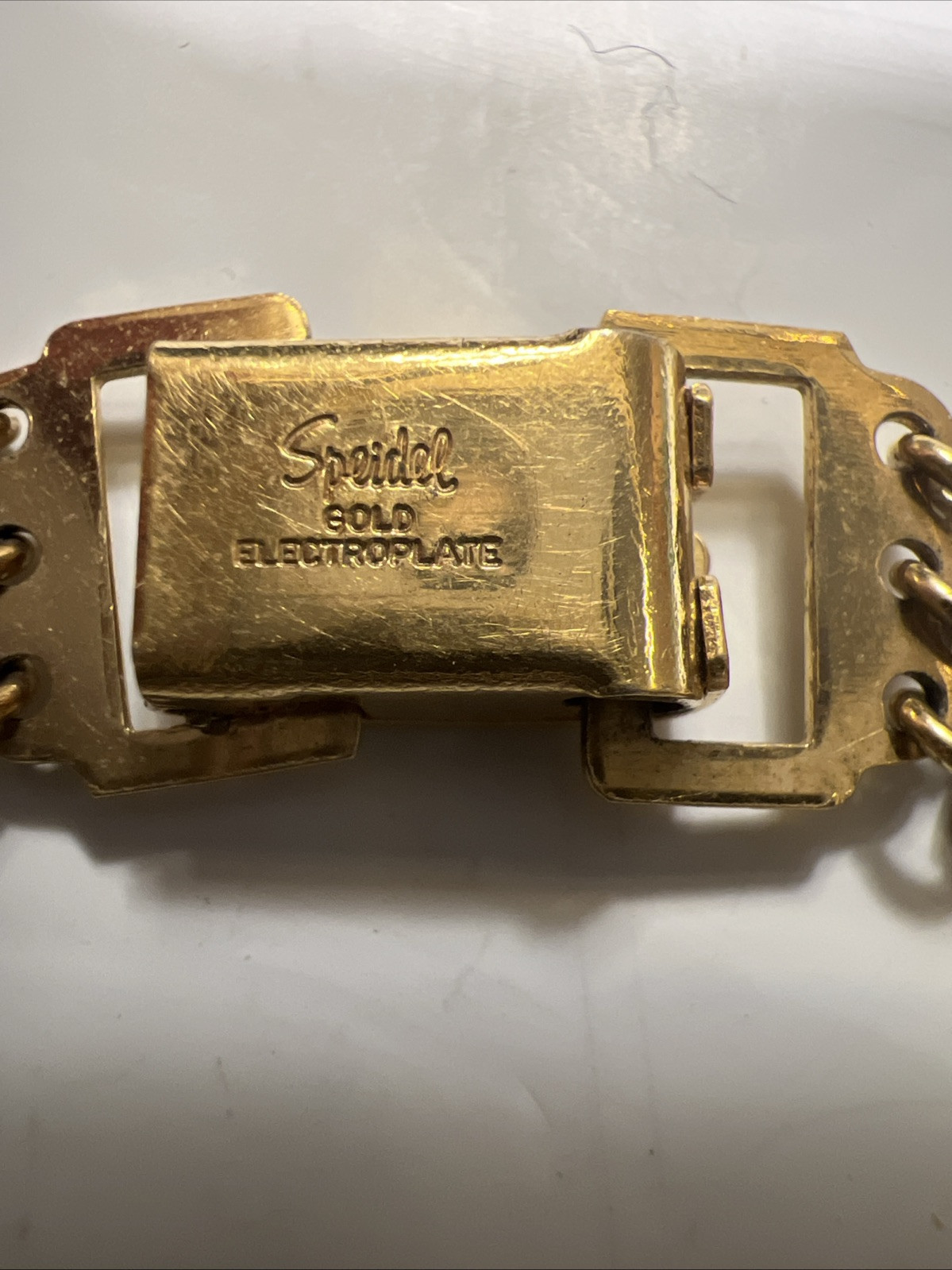 This vintage Speidel bracelet features a gold plated chain with a round ID plaque, dated back to 1969. The bracelet is designed with a snap closure for easy wear. The piece is a classic and timeless accessory, suitable for women who appreciate vintage jewelry with a touch of elegance. The bracelet does not feature any stones, making it a versatile piece that can be worn on its own or layered with other bracelets for a stylish look.