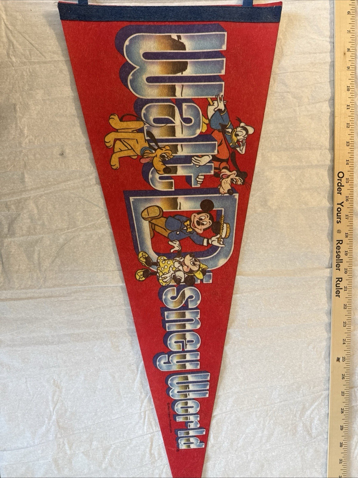 The product is a vintage full-size pennant from Walt Disney World featuring characters Mickey Mouse, Minnie Mouse, Donald Duck, Goofy, and Pluto. Released in 1980, this collectible item is a nostalgic piece of Disneyana that captures the essence of the beloved Disney franchise. With its classic design and iconic characters, this pennant would make a cherished memento for any Disney fan or collector of theme park souvenirs.