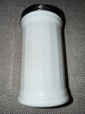 This vintage style milk glass style sugar dispenser is a charming addition to any dining room or collection. With its ribbed pattern and 1960s style, this medium-sized sugar shaker is both practical and aesthetically pleasing. Made of white glass and featuring a removable lid, this original piece exudes a nostalgic diner restaurant vibe that is sure to be a conversation starter. Perfect for those who appreciate classic design and vintage kitchen decor.