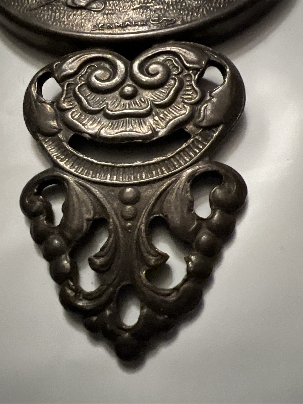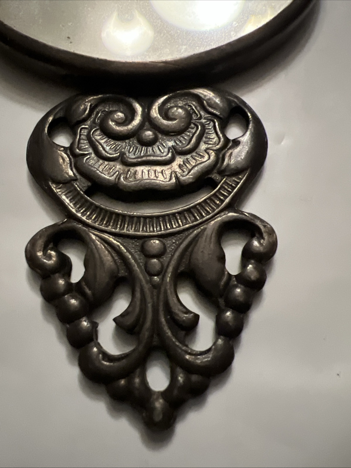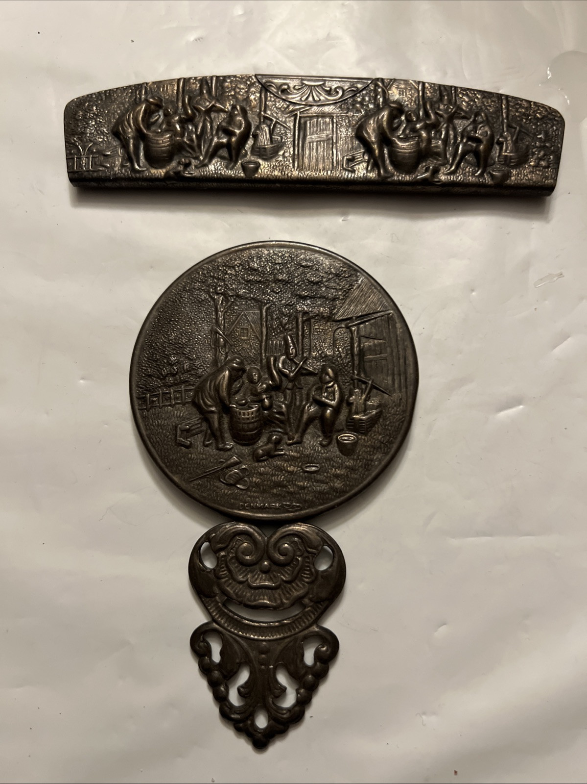 Denmark Repousse Beveled Hand Travel Mirror & Celluloid Comb Set antique Defect