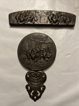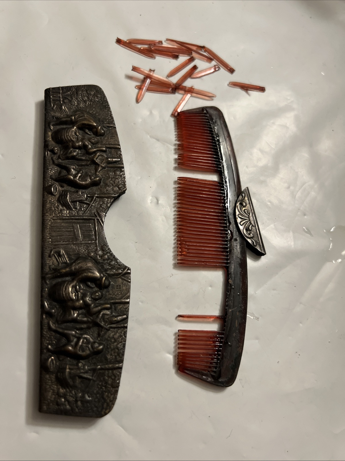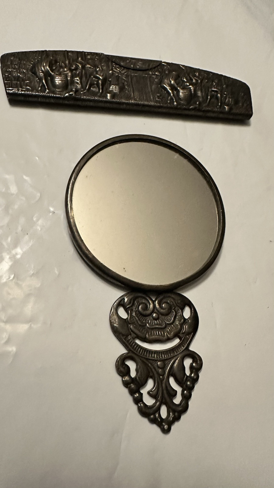 The comb is fragile and some of the tines have broken. Please review pics This vintage hand mirror and comb set is a beautiful collectible piece from Denmark. The mirror features a unique repousse design with beveled edges, giving it an antique look. Measuring 4 inches in size, this set is made of glass and is a perfect travel accessory. The Danish craftsmanship adds a touch of elegance to this set, making it a desirable addition to any vanity or collection. All the teeth to the comb is there very old and delicate.