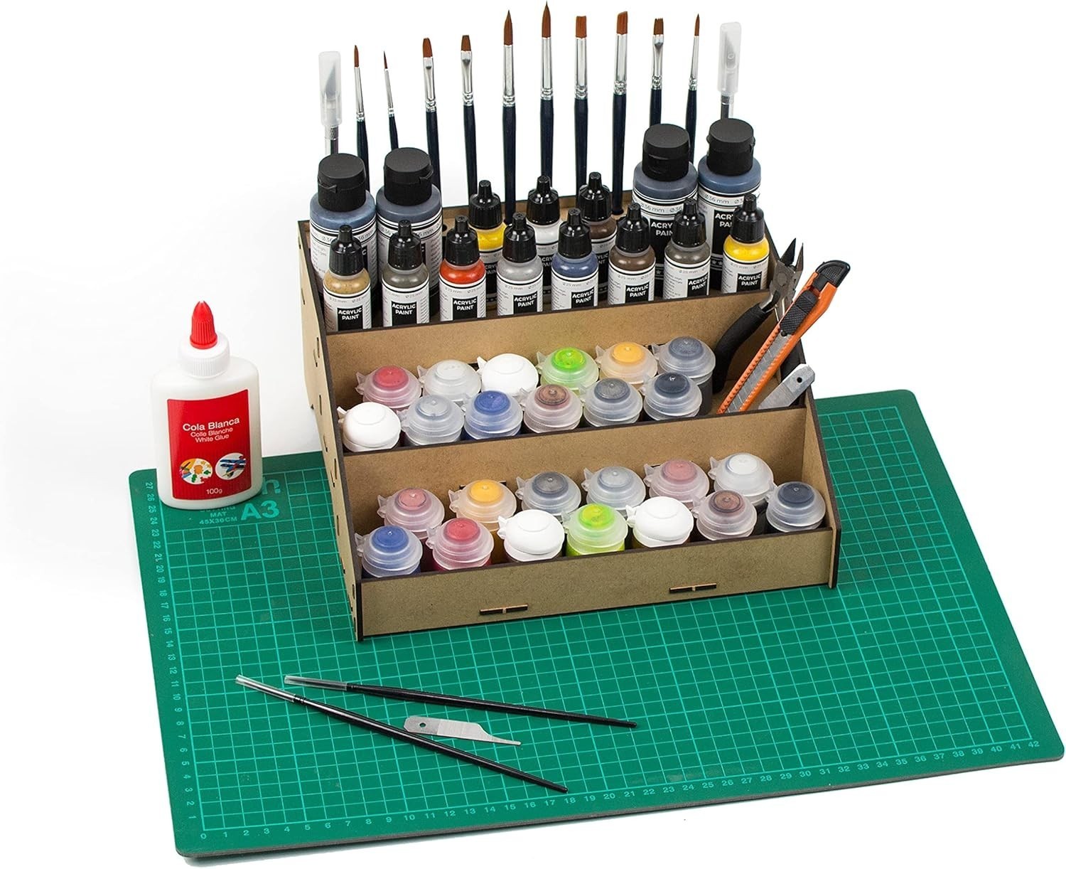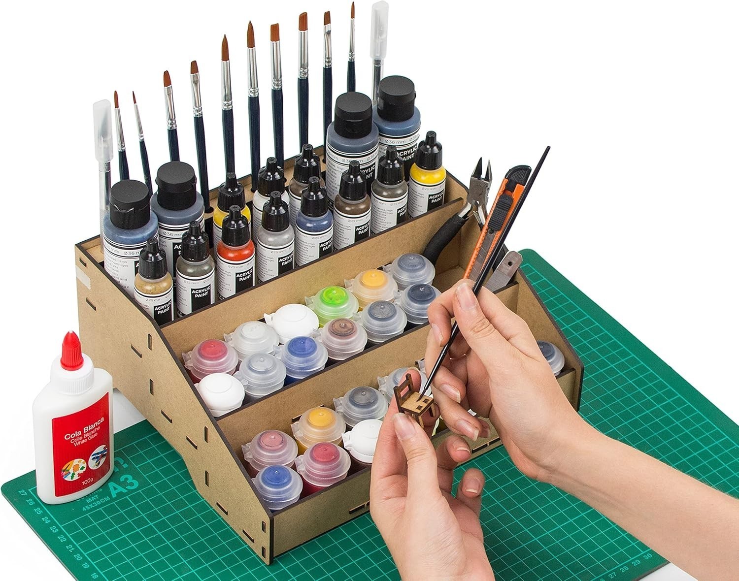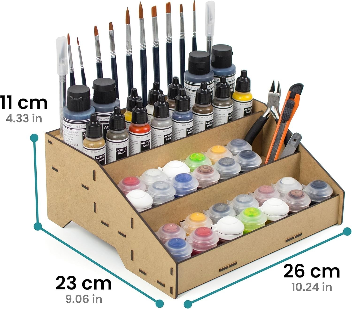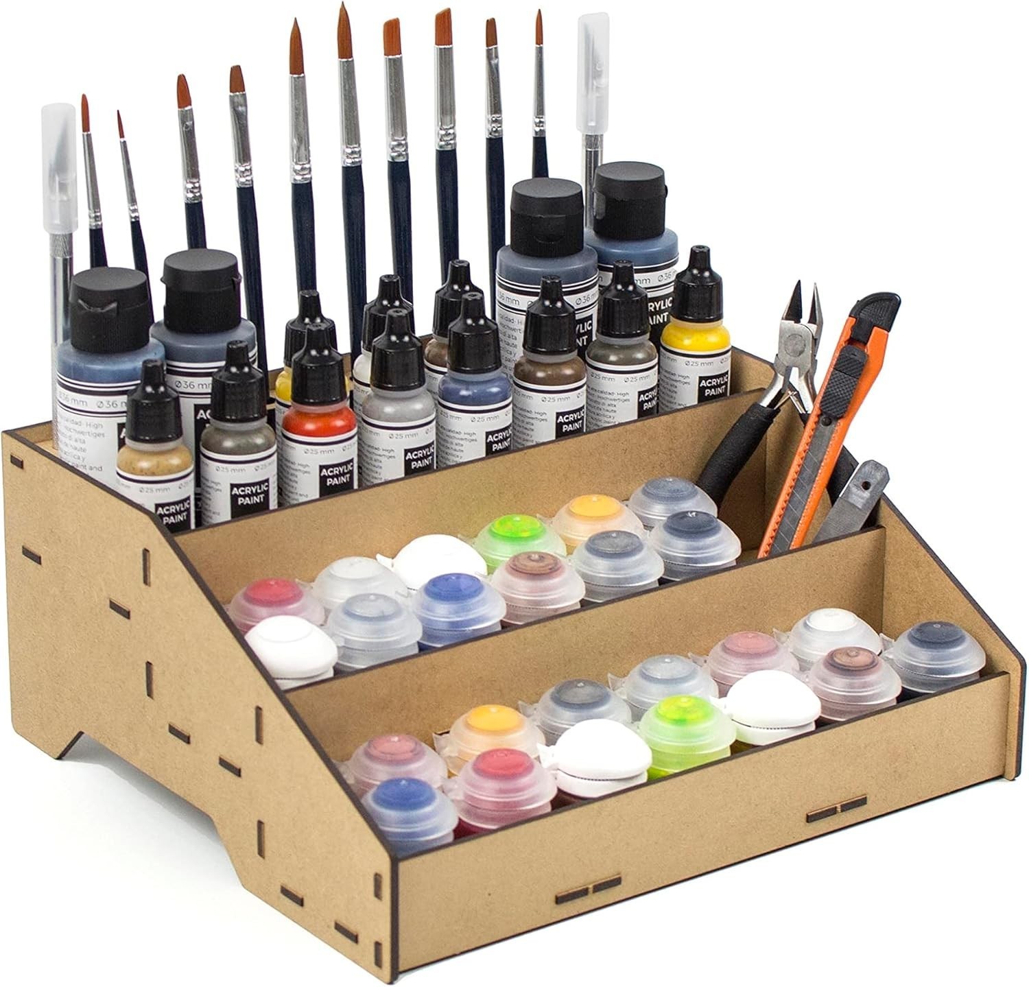 Enhance your modeling and miniature painting setup with our versatile Paint Organizer. Crafted to accommodate popular paint pots from Citadel, Vallejo, Tamiya, Army Painter, and AK Interactive, this acrylic storage solution features dedicated brush slots to keep your tools neatly organized. Its design promotes a tidy workspace, prevents spills, and simplifies stock management?making it an ideal gift for Warhammer and miniature enthusiasts. Easy to assemble with included instructions, the sturdy stand is handcrafted in , supporting local craftsmanship. Please verify the diameter of your paint pots before purchasing.