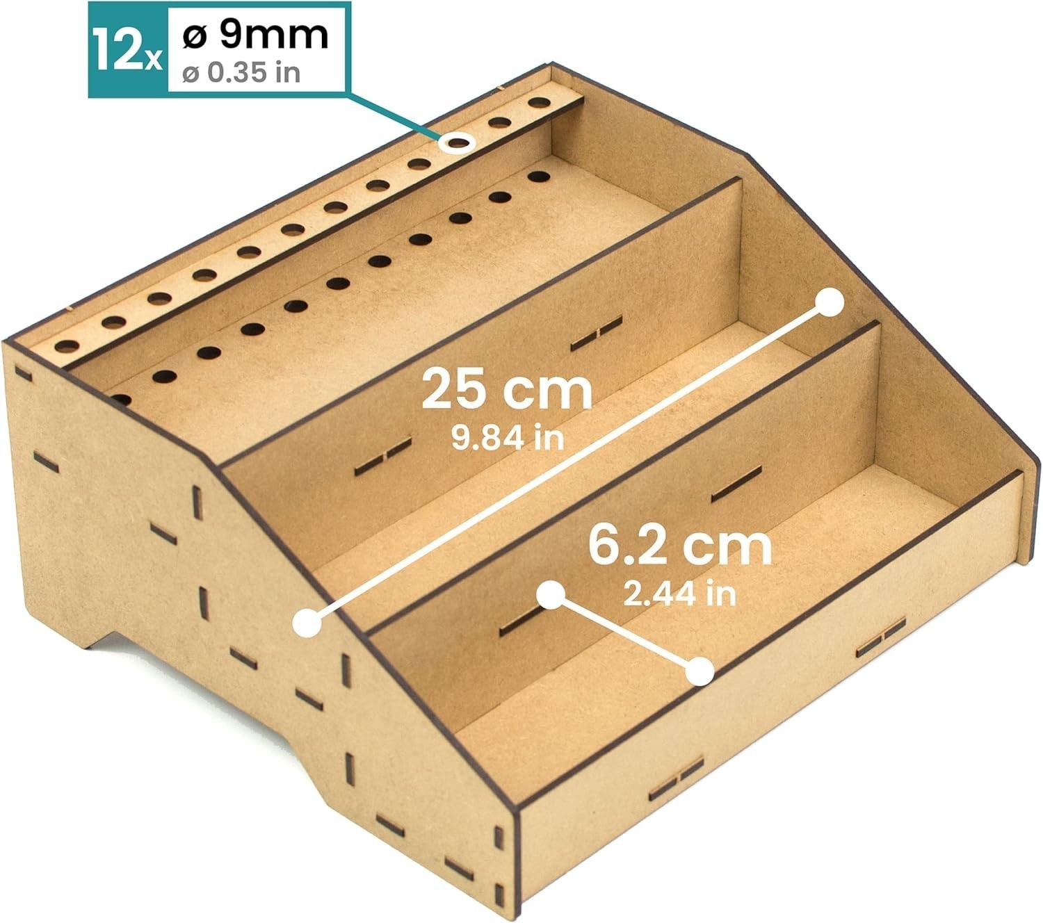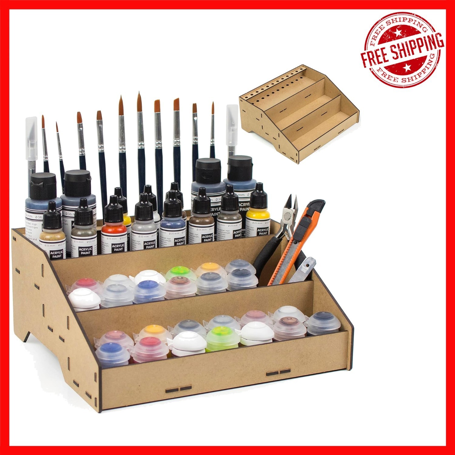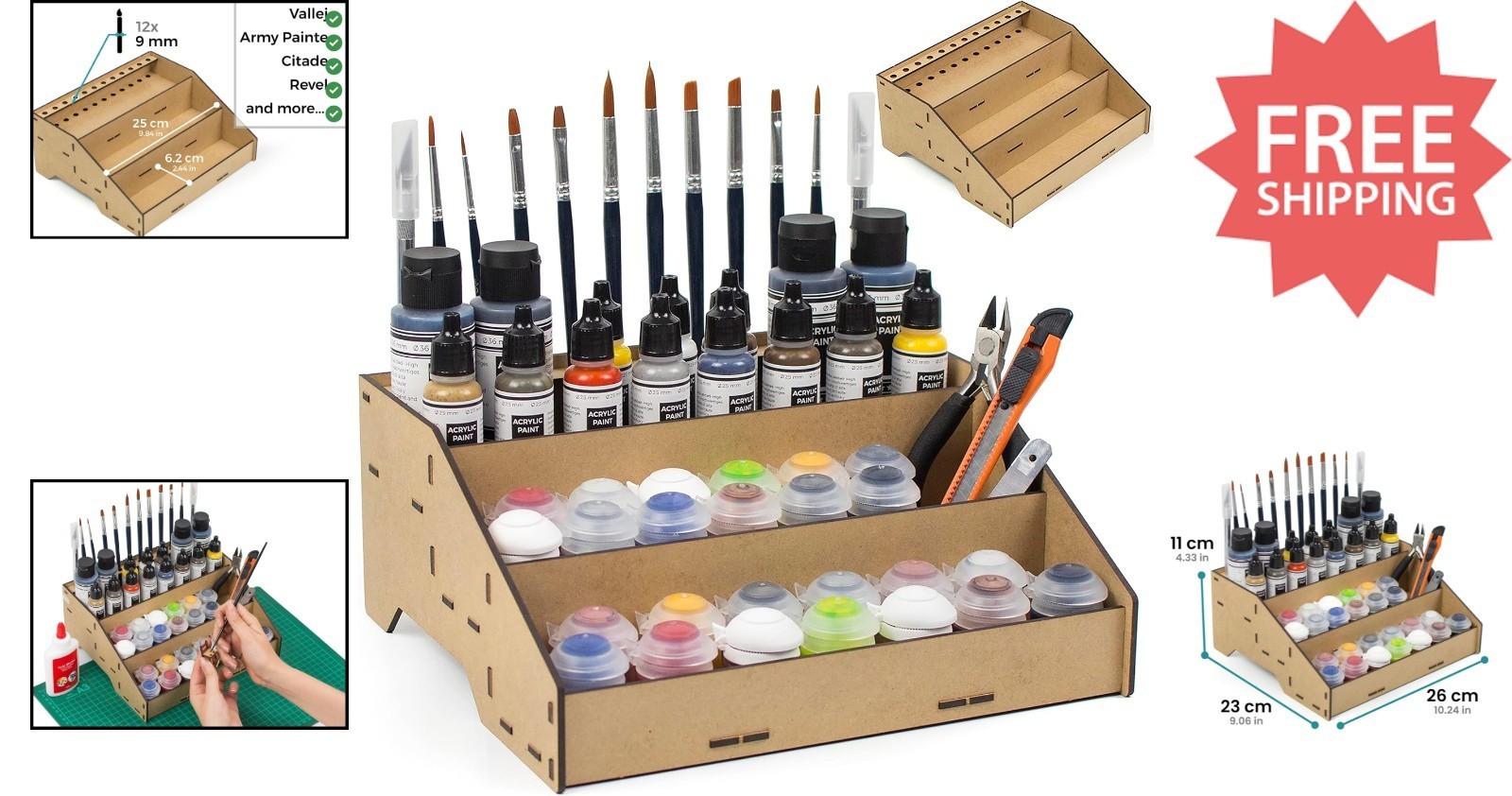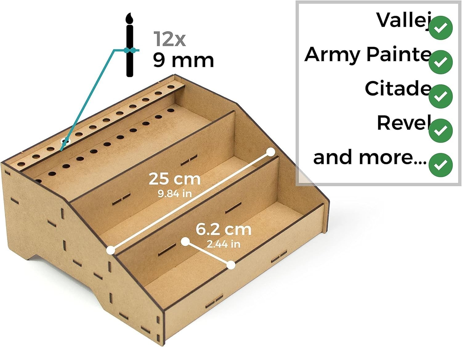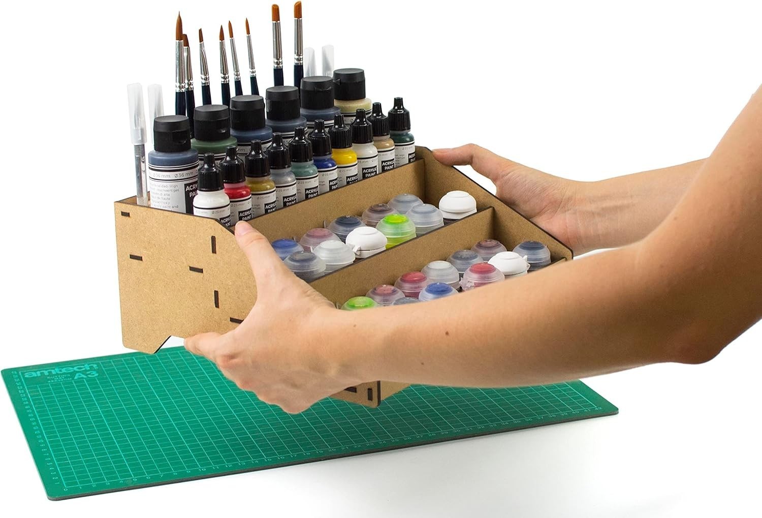 Enhance your modeling and miniature painting setup with our versatile Paint Organizer. Crafted to accommodate popular paint pots from Citadel, Vallejo, Tamiya, Army Painter, and AK Interactive, this acrylic storage solution features dedicated brush slots to keep your tools neatly organized. Its design promotes a tidy workspace, prevents spills, and simplifies stock management?making it an ideal gift for Warhammer and miniature enthusiasts. Easy to assemble with included instructions, the sturdy stand is handcrafted in , supporting local craftsmanship. Please verify the diameter of your paint pots before purchasing.