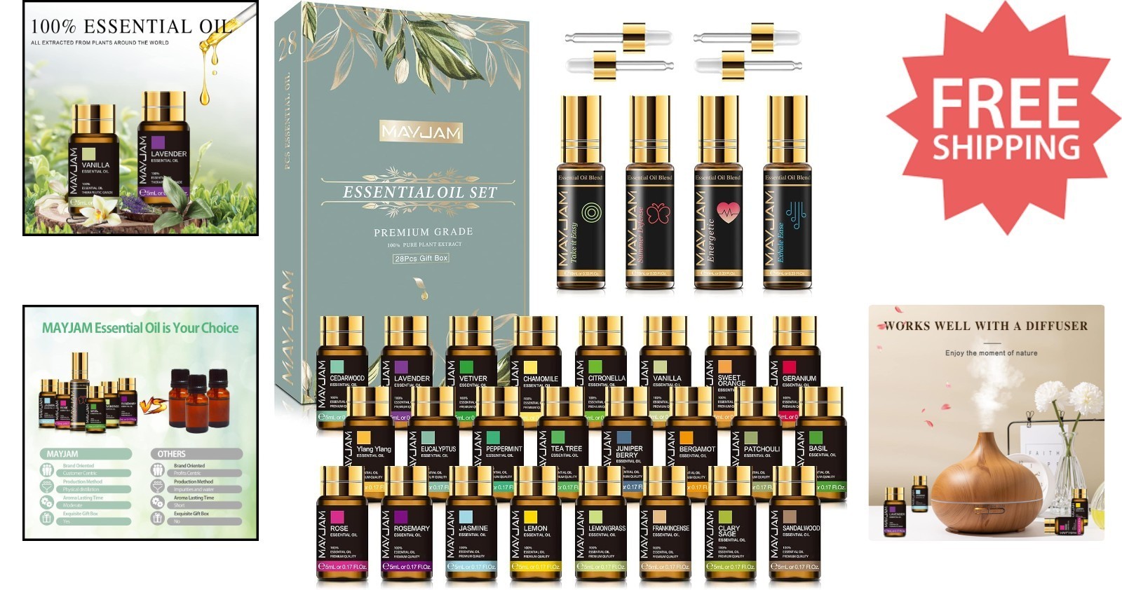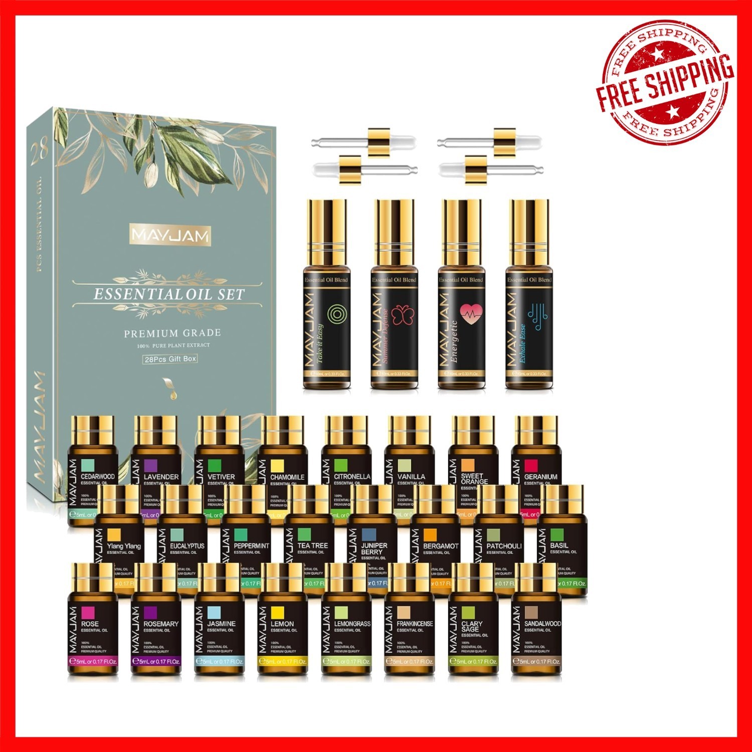 Discover the ultimate aromatherapy experience with MAYJAM's 28-in-1 Essential Oil Set. Featuring a rich selection of highly concentrated oils including Lavender, Jasmine, Eucalyptus, Vanilla, Peppermint, Sandalwood, and more, each sourced from plant flowers, leaves, or other parts for a pure, complex, and long-lasting aroma. Whether used with a diffuser, DIY projects like candles and bath bombs, or for home care, these essential oils are versatile and perfect for creating a soothing environment. Packaged in a stylish gift box, this starter kit makes an ideal gift for loved ones on any special occasion. Perfect for beginners exploring aromatherapy, this set allows you to experience a world of fragrant possibilities.