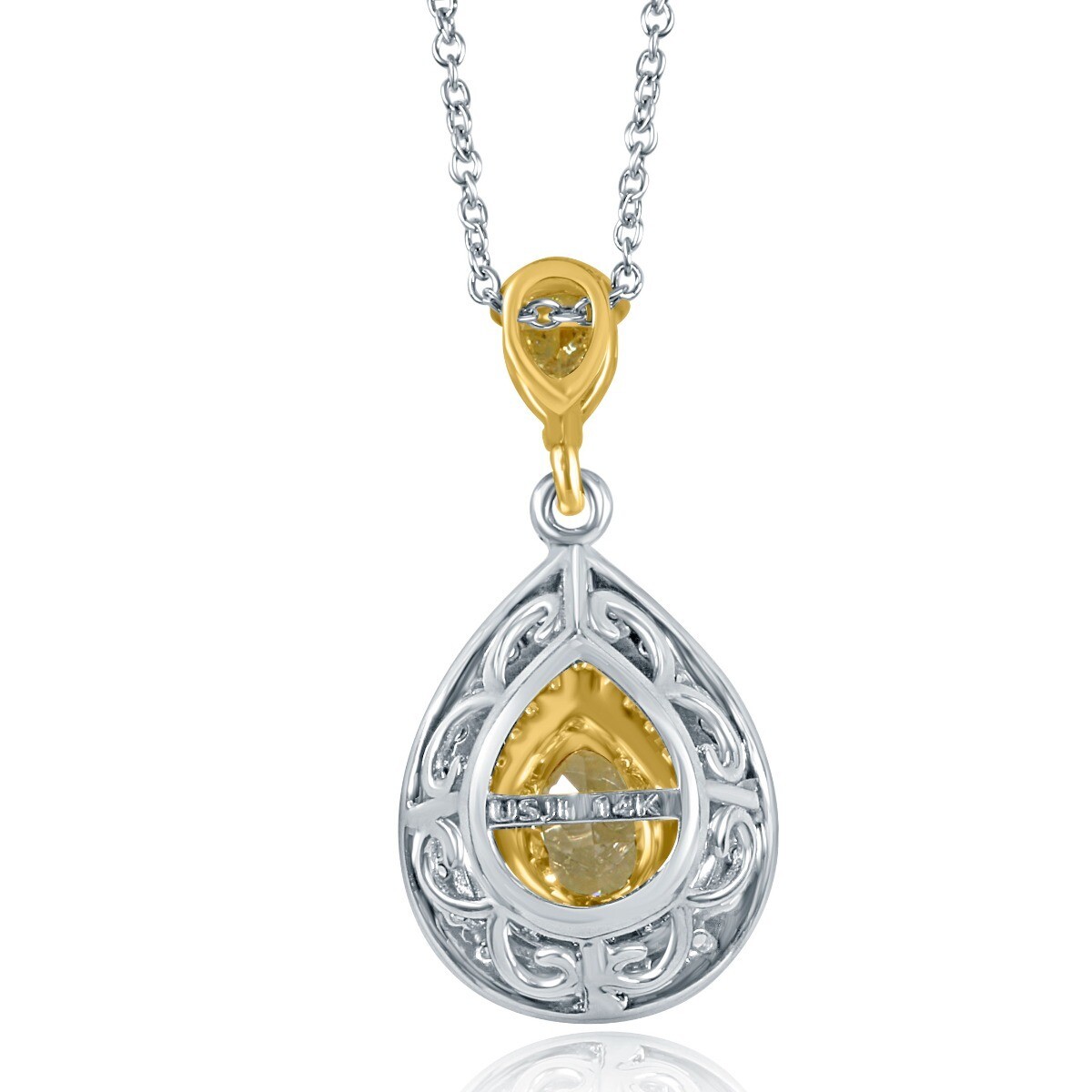 From exclusive designer style to timeless classic, this is a luxurious pendant for your lovely one! This beautifully styled pendant features a 0.42 carat pear brilliant cut natural fancy yellow diamond center surrounded by a double halo of 0.38 carats colorless and yellow round cut diamonds. A 0.31 carat pear cut natural fancy yellow diamond holds the halo adding an extra Sparkle to this pendant. Handcrafted of 14-karat multi tone gold, this necklace features a 16" rolo chain and polished finish. The total carat weight is 1.11 carats.
