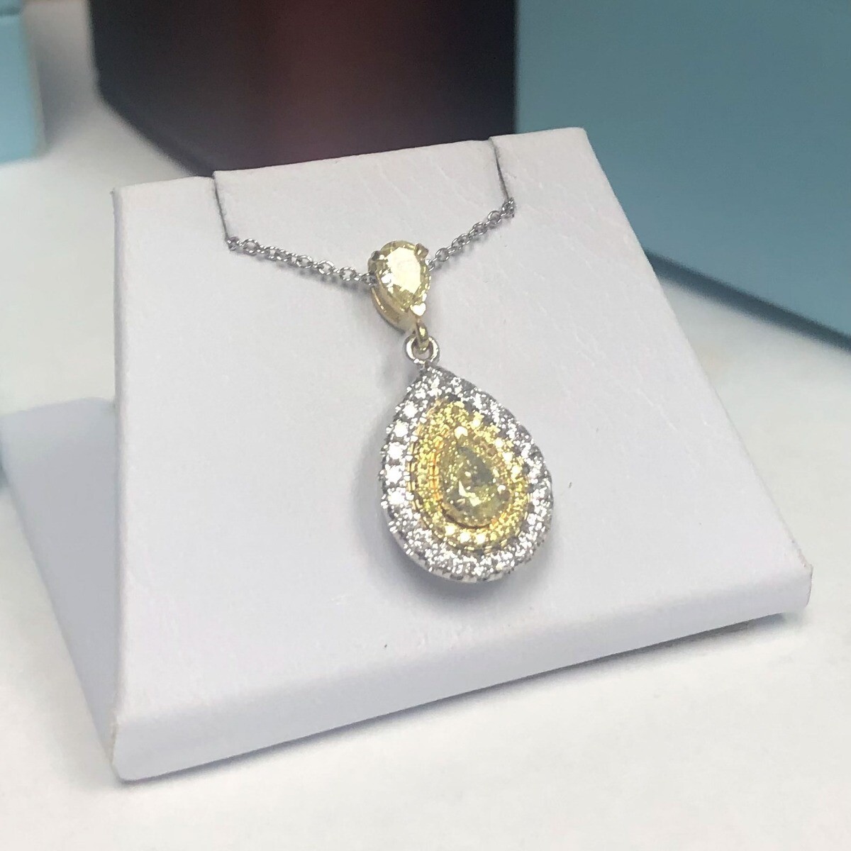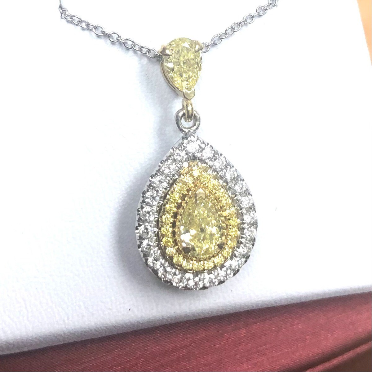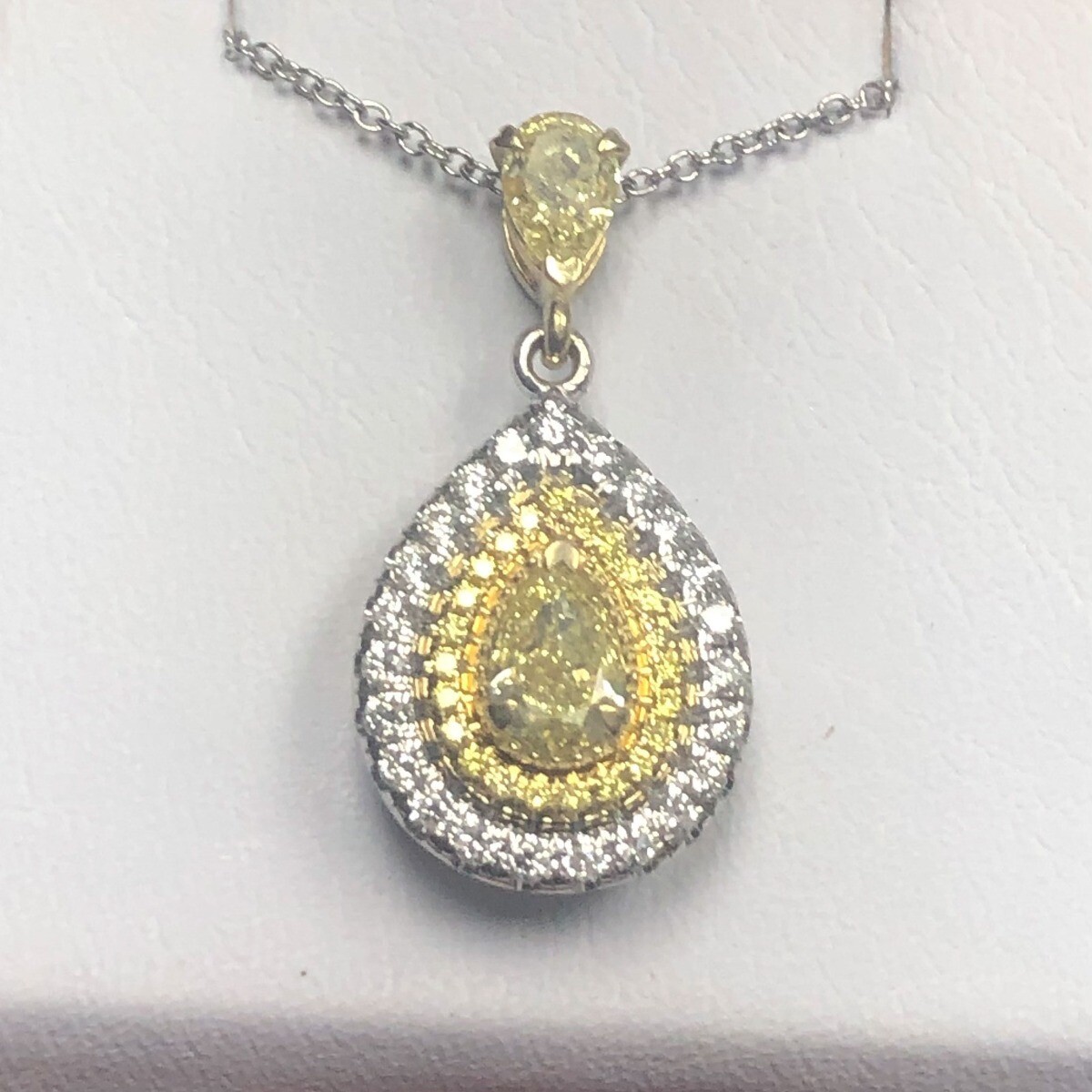 From exclusive designer style to timeless classic, this is a luxurious pendant for your lovely one! This beautifully styled pendant features a 0.42 carat pear brilliant cut natural fancy yellow diamond center surrounded by a double halo of 0.38 carats colorless and yellow round cut diamonds. A 0.31 carat pear cut natural fancy yellow diamond holds the halo adding an extra Sparkle to this pendant. Handcrafted of 14-karat multi tone gold, this necklace features a 16" rolo chain and polished finish. The total carat weight is 1.11 carats. Our products are all hand made with quality and care, in the heart of the diamond district on 47th Street in New York City. Our dedication and commitment to fine work and quality exceeds all others. Since all of our products are handmade in the USA, every pie