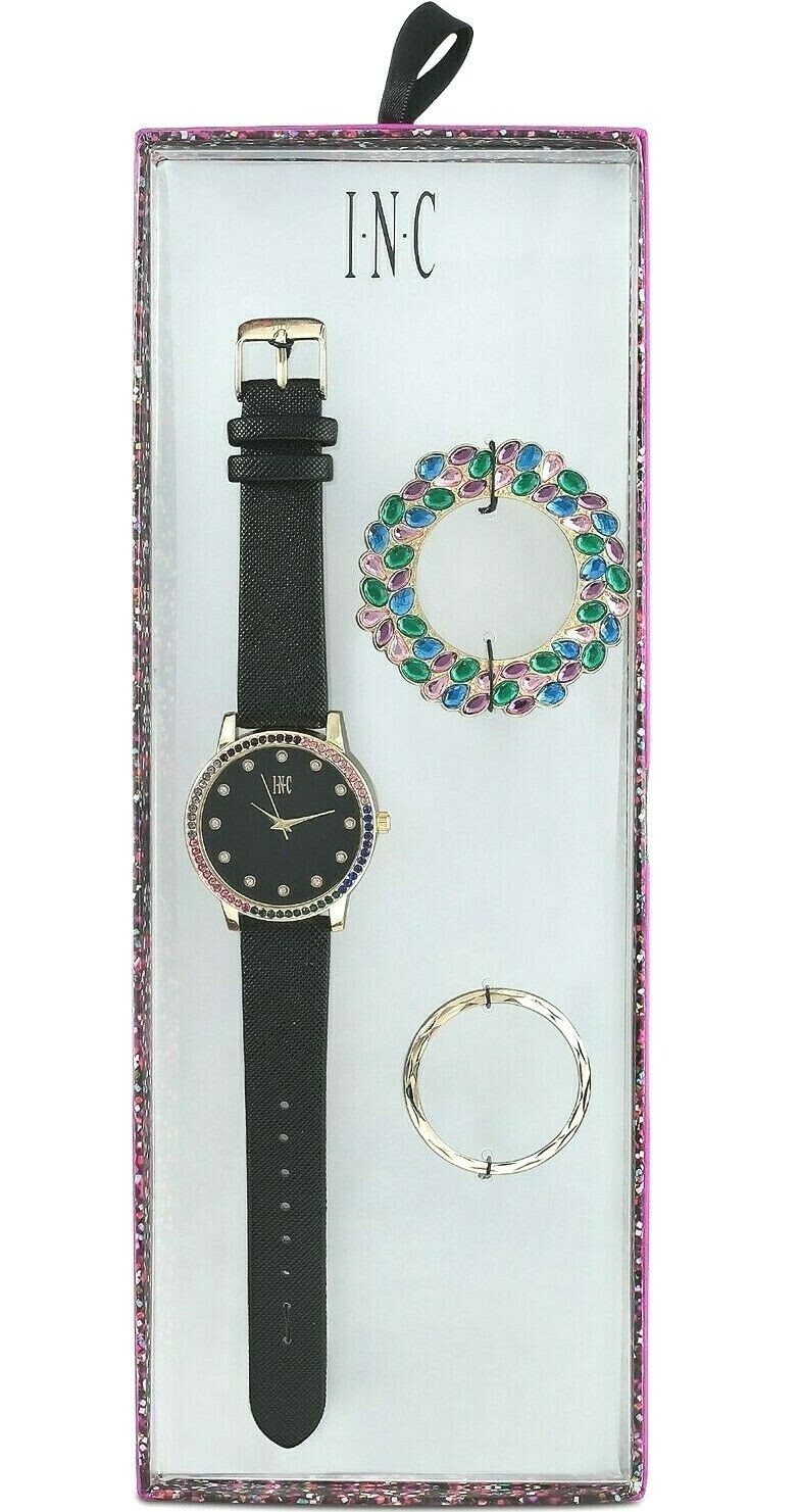 This is for a brand new with tags I.N.C. Women's Black Faux Leather Strap 38mm Watch with Interchangeable Bezels in fuchsia gift box Multicolored crystals encircle the sparkling dial of this joyful black and gold-tone timepiece from I.N.C. International Concepts. Movement: three-hand quartz Case: round gold-tone mixed-metal; 38mm with interchangeable bezel Strap: black faux leather with buckle closure Dial: black with crystal indices Water resistance: not water resistant