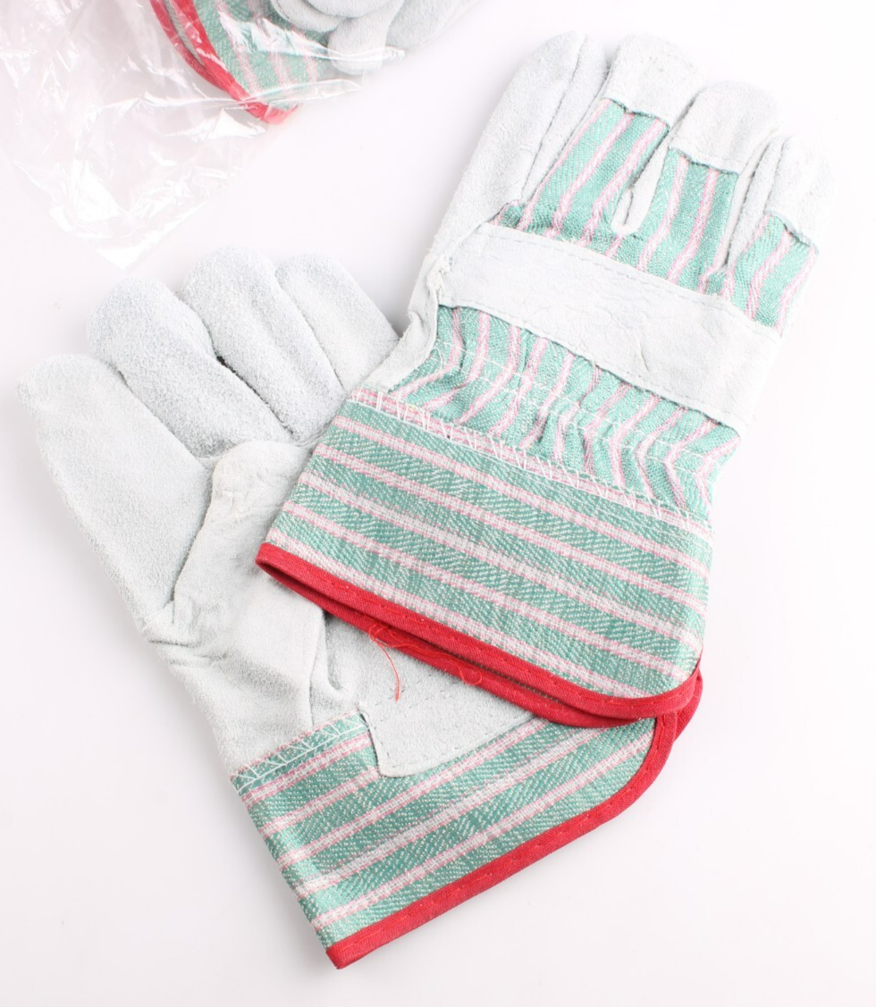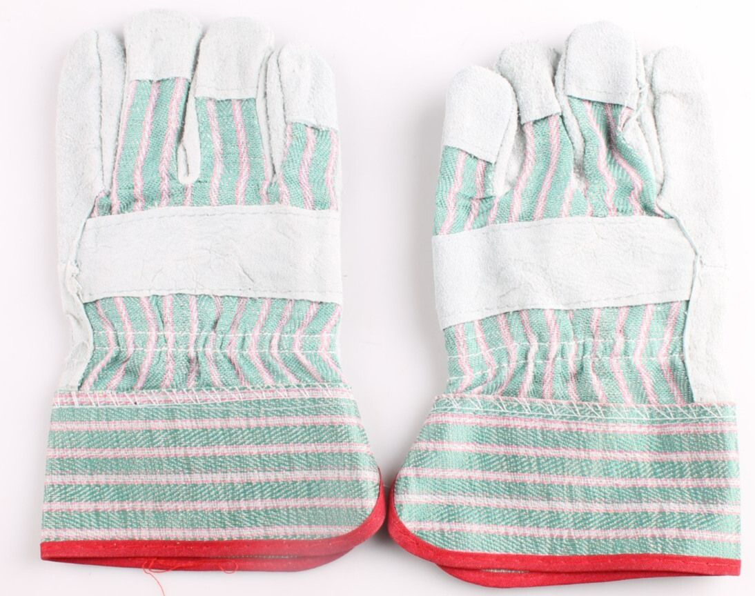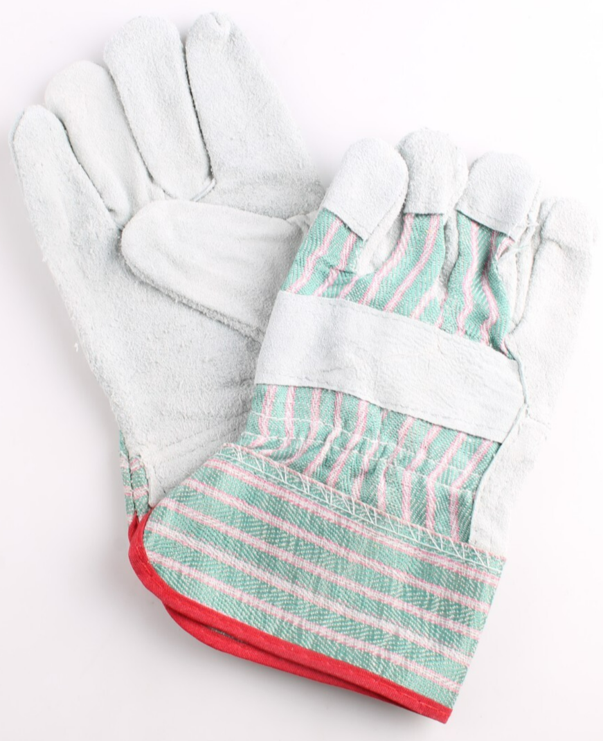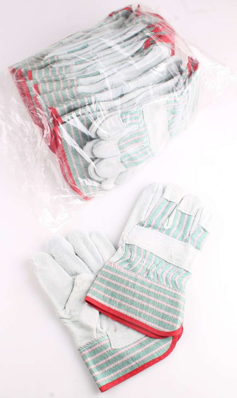 This cowhide, split leather palm is derived from the shoulder section of the hide. It features a pink/green striped canvas back, 2.5-inch starched safety cuff, and a gunn pattern a?? the most common pattern used for work gloves. Crafted for durability and comfort, these Industrial Leather Palm Safety Cuff Gloves boast a robust construction that pairs a leather palm with a cuff design to offer both protection and flexibility. The gloves, featuring a distinctive green and pink stripe, are ideally suited for a range of tasks where safety and a secure grip are PARAMOUNT. Whether you're engaged in outdoor work or handling equipment, these gloves provide the resilience needed to handle demanding conditions. Their design ensures a snug fit, minimizing the risk of slippage while enhancing overall