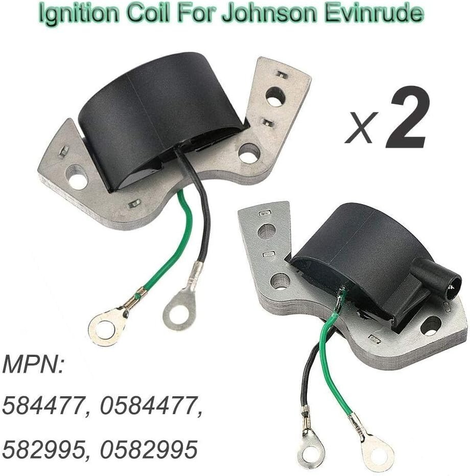 The product is a set of two branded ignition coils designed for Johnson Evinrude engines ranging from 2-40HP. These coils are manufactured in the United States and have the part numbers 580416, 582995, and 584477. They are crucial components for ensuring proper functioning of the ignition and starting systems in outboard engines, making them essential parts for boat enthusiasts and mechanics looking to maintain or repair their vessels' engines.