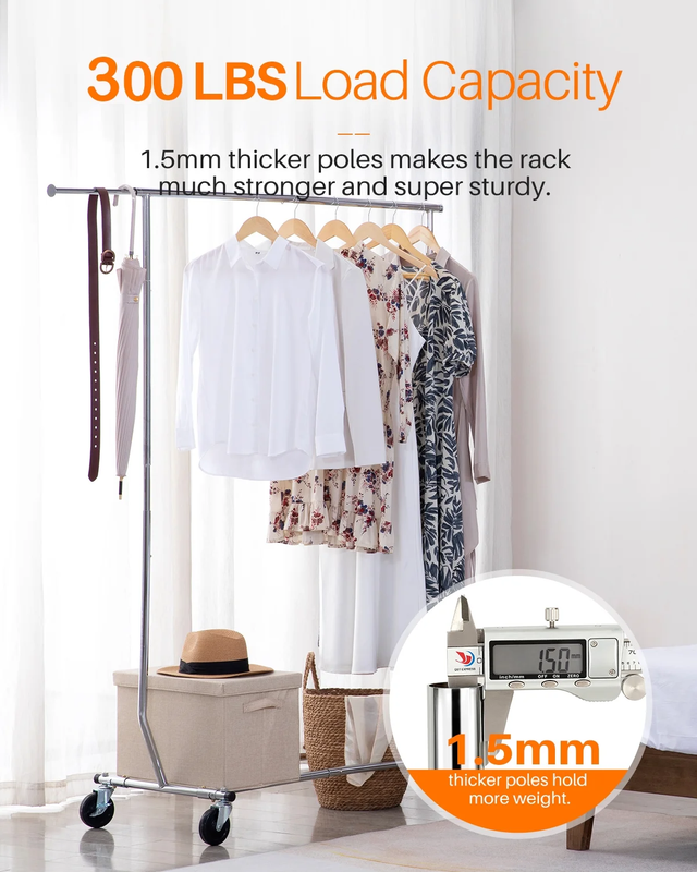 ?300 Lbs Load Capacity?- HOKEEPER garment rack is made of heavy duty steel with chrome finish. The thickness of our pole is 1.5mm, which makes this clothing rack much thicker and sturdier than others 0.7-0.8mm. The maximum load capacity of this commercial rolling clothes rack is 300 pound, strong enough for your storage needs.